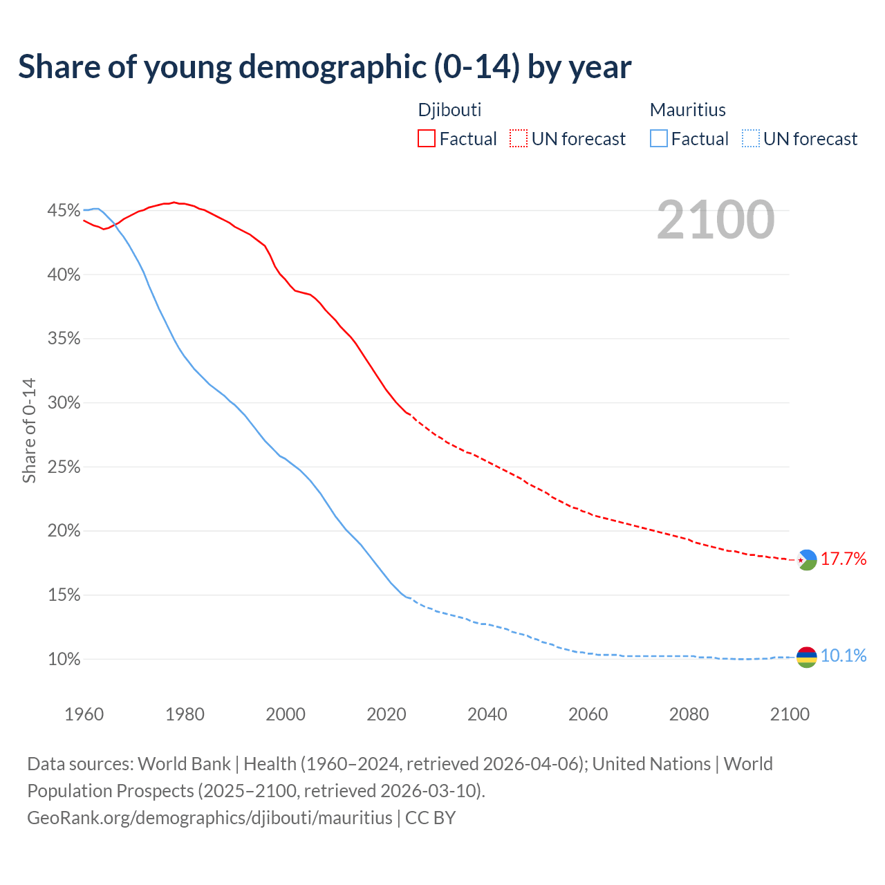 - The share of young demographic (0-15 years old) in Djibouti is 29.2% vs 14.8% in Mauritius.
