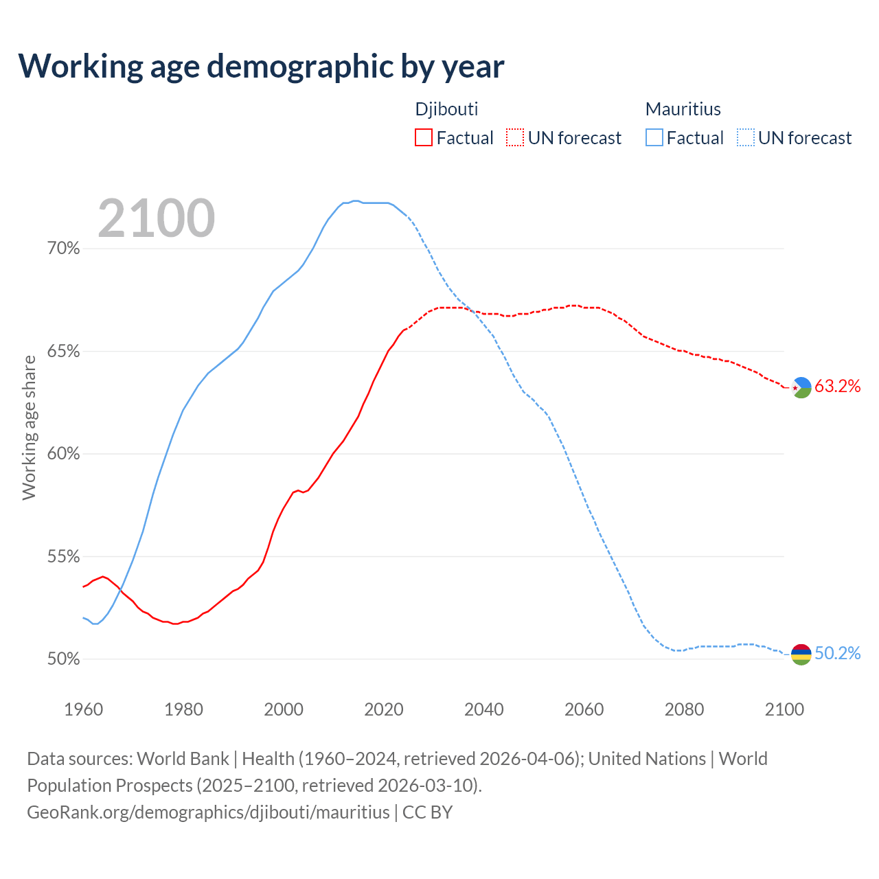 The share of older people aged 65 and over is 4.85% in Djibouti and 13.5% in Mauritius. Life expectancy in Djibouti compared to Mauritius .