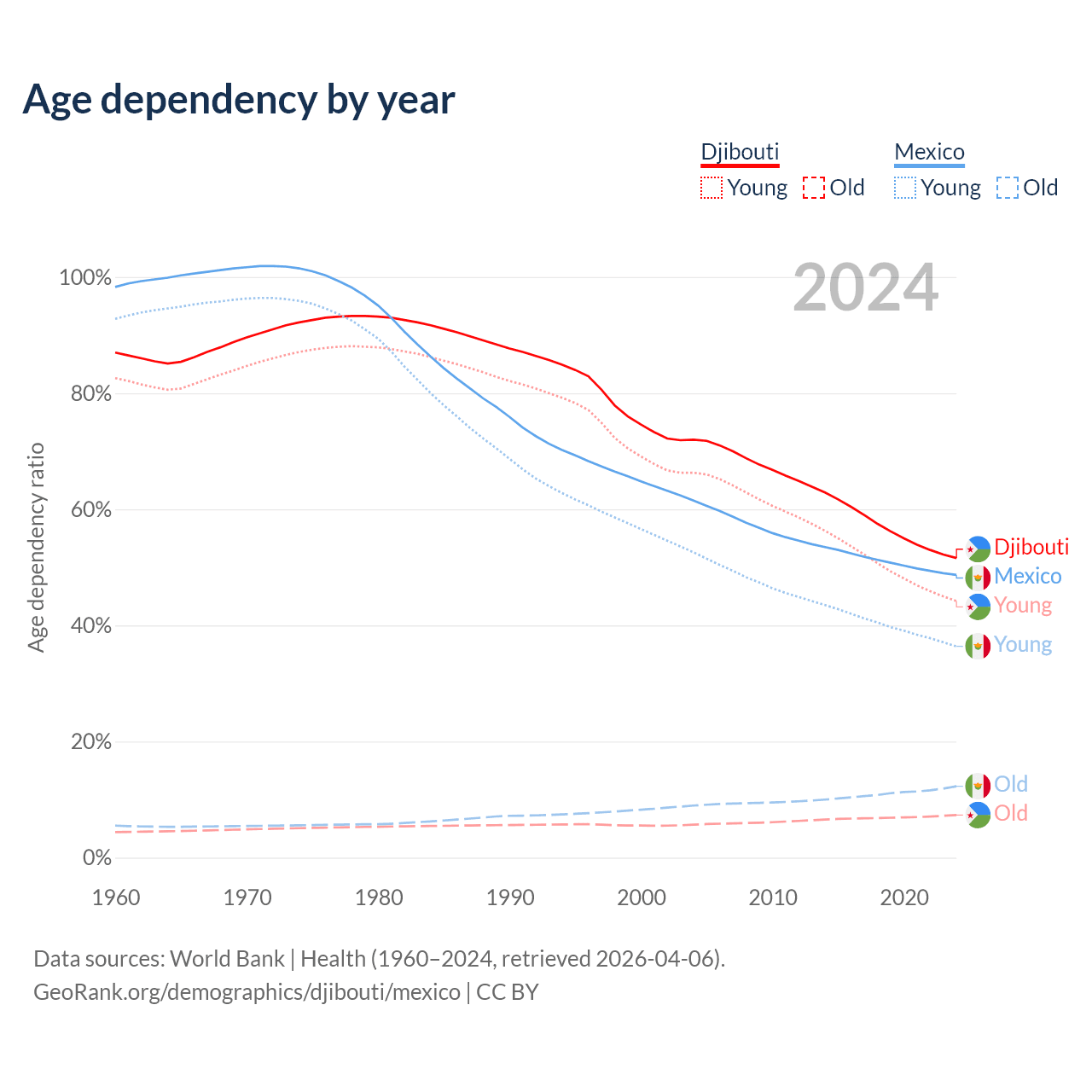 - Djibouti is ranked 129/196 by median age (oldest to youngest) vs 102/196 for Mexico.