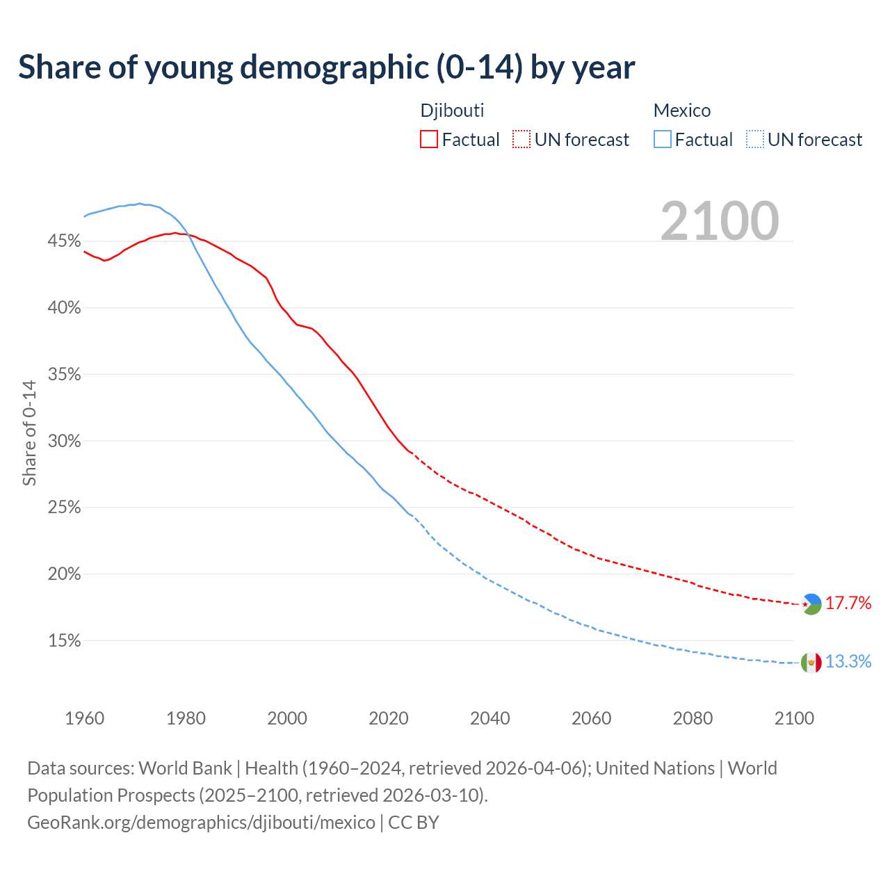 - The share of young demographic (0-15 years old) in Djibouti is 29.2% vs 24.5% in Mexico.