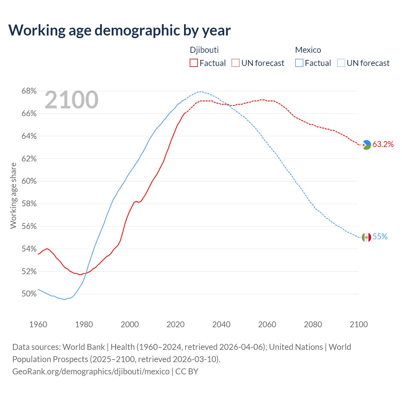 Median age Djibouti vs Mexico, 1960-2100