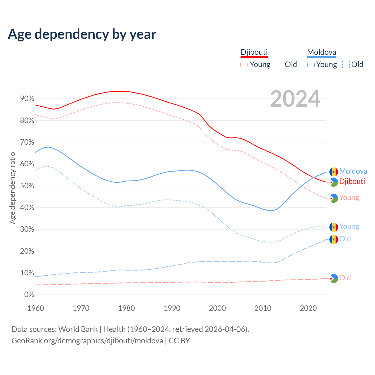 - The share of old-age demographic (65+) in Djibouti is 4.85% vs 16.2% in Moldova.