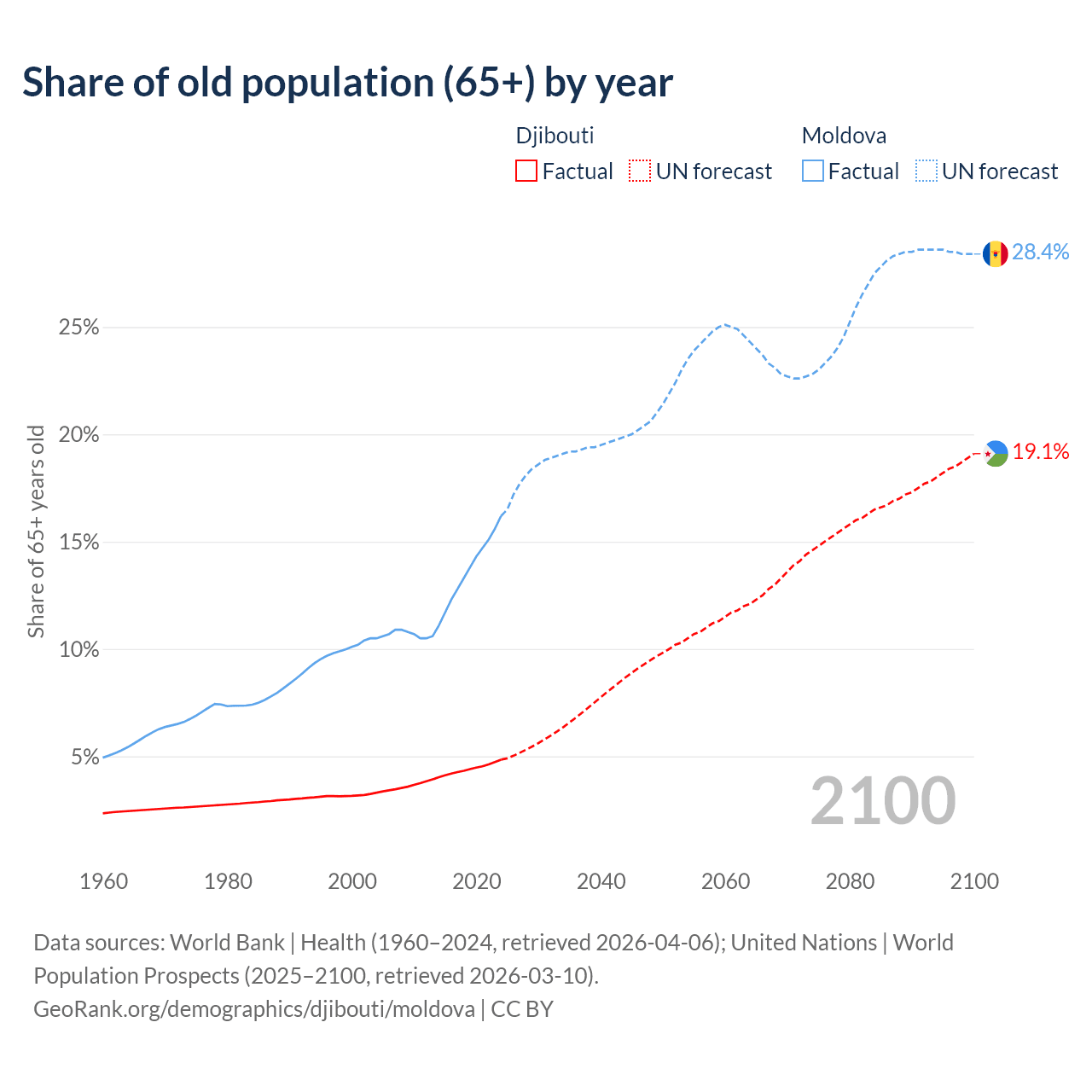 The share of older people aged 65 and over is 4.85% in Djibouti and 16.2% in Moldova. Life expectancy in Djibouti compared to Moldova .