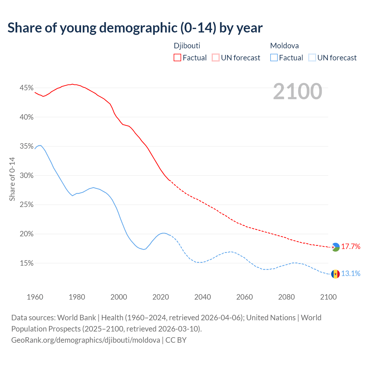 - The share of young demographic (0-15 years old) in Djibouti is 29.2% vs 19.8% in Moldova.