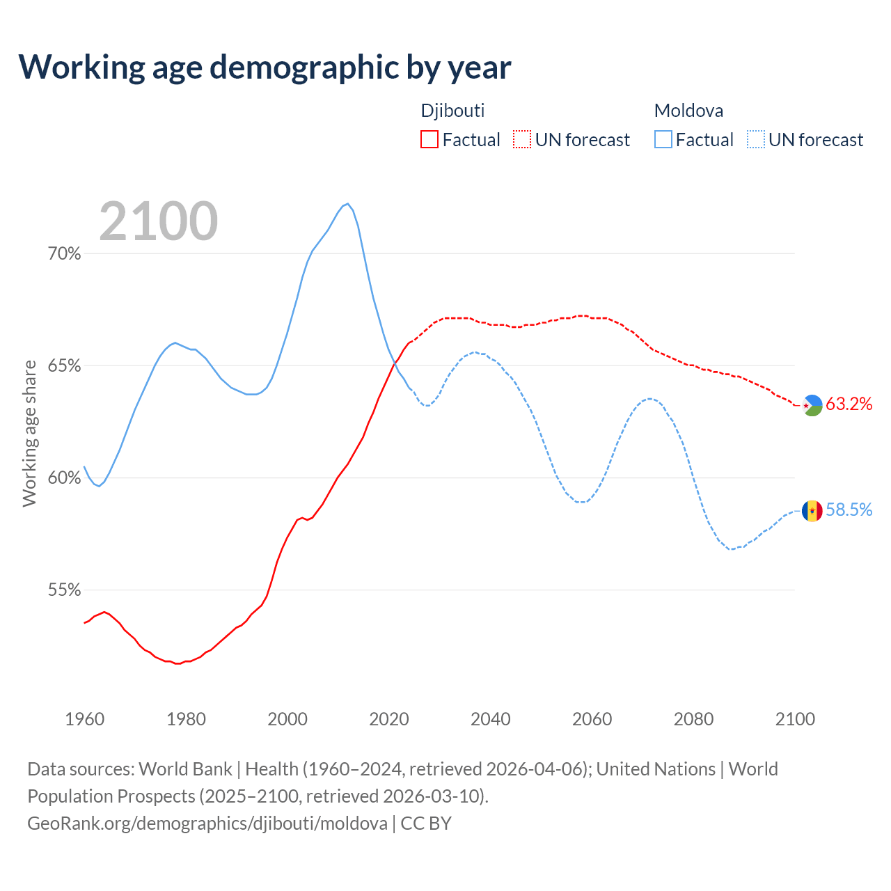 Median age Djibouti vs Moldova, 1960-2100