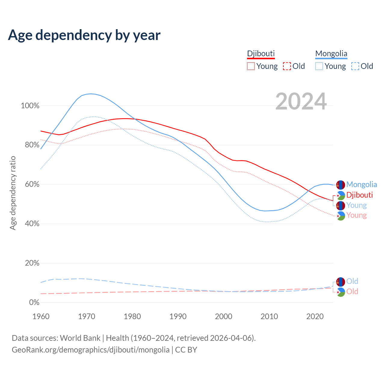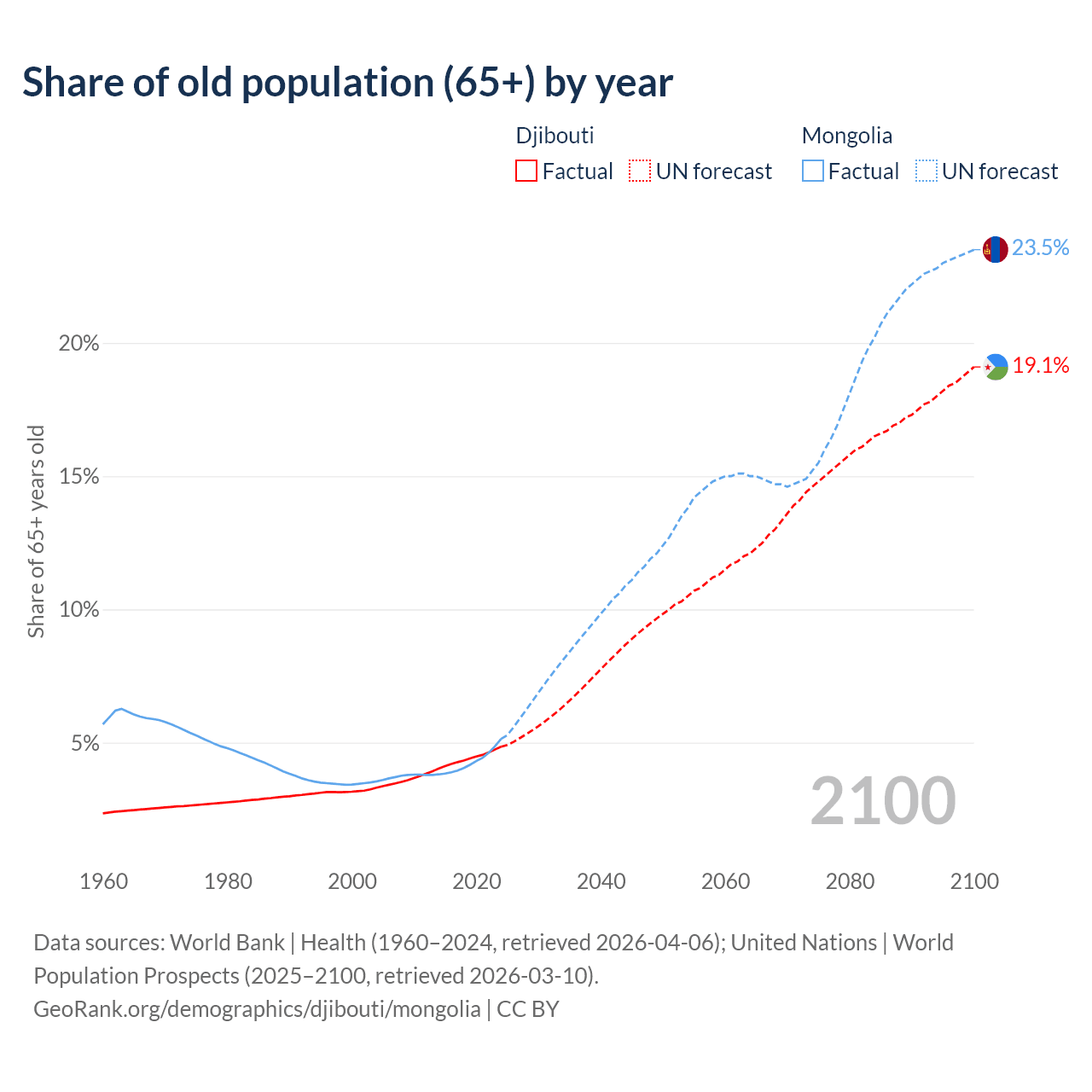 - The share of old-age demographic (65+) in Djibouti is 4.85% vs 5.14% in Mongolia.
