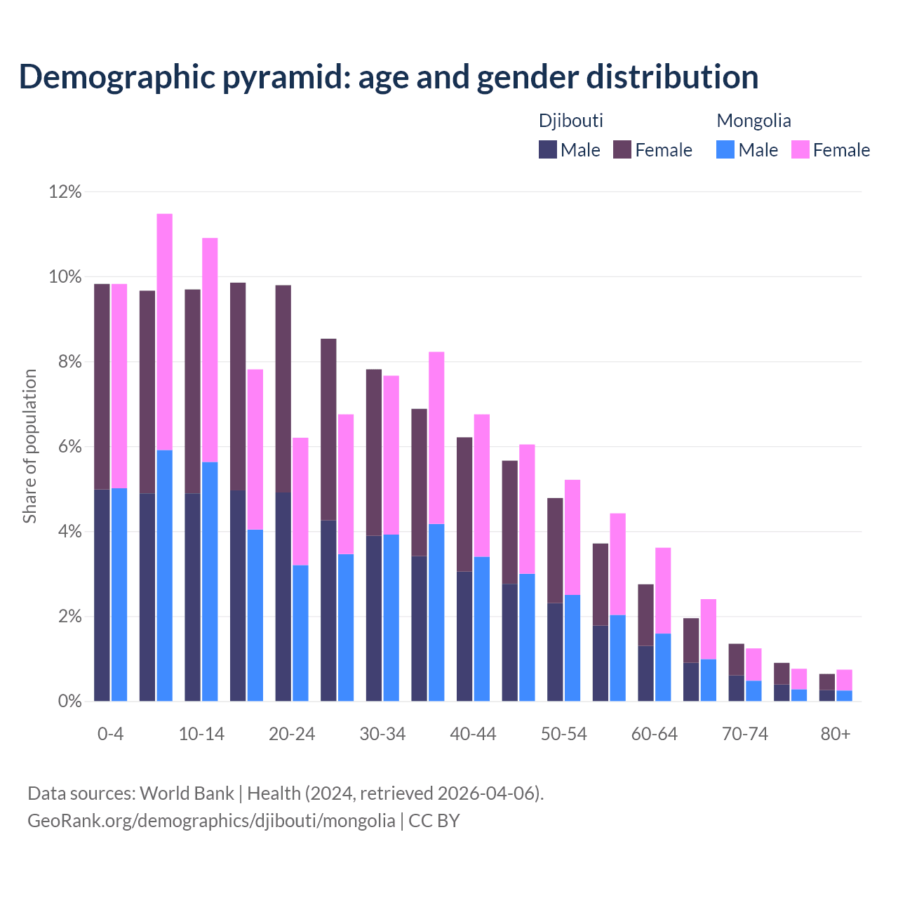 - Djibouti is ranked 129/196 by median age (oldest to youngest) vs 117/196 for Mongolia.