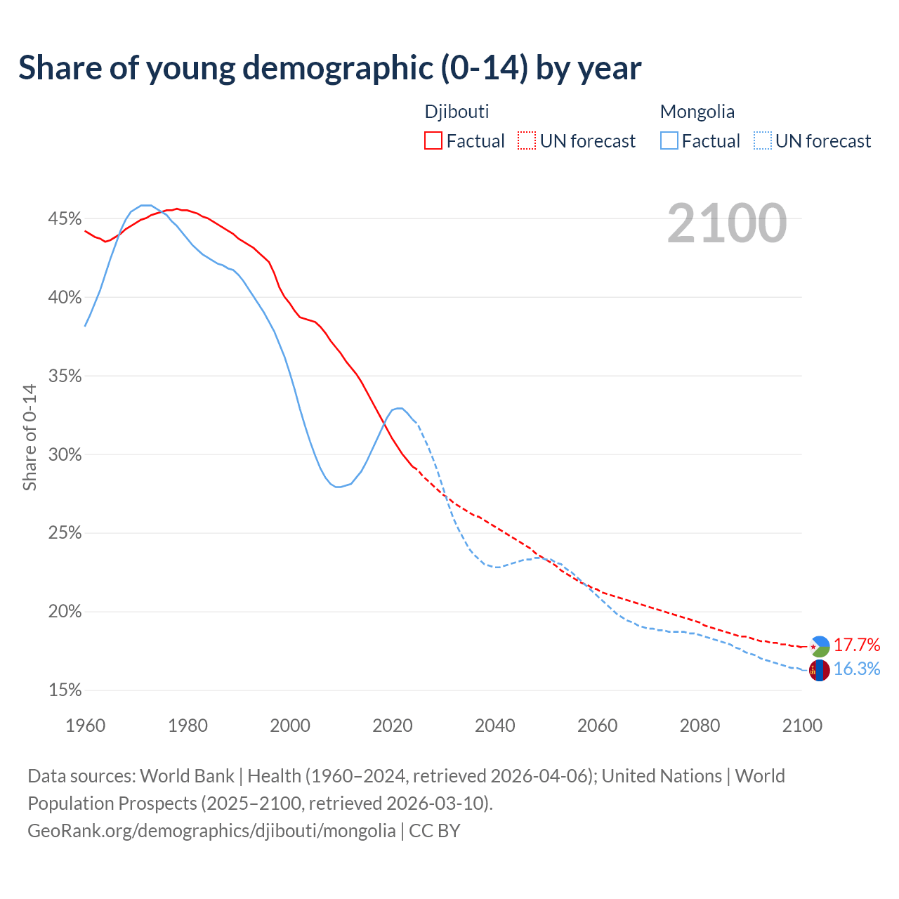 - The share of young demographic (0-15 years old) in Djibouti is 29.2% vs 32.2% in Mongolia.
