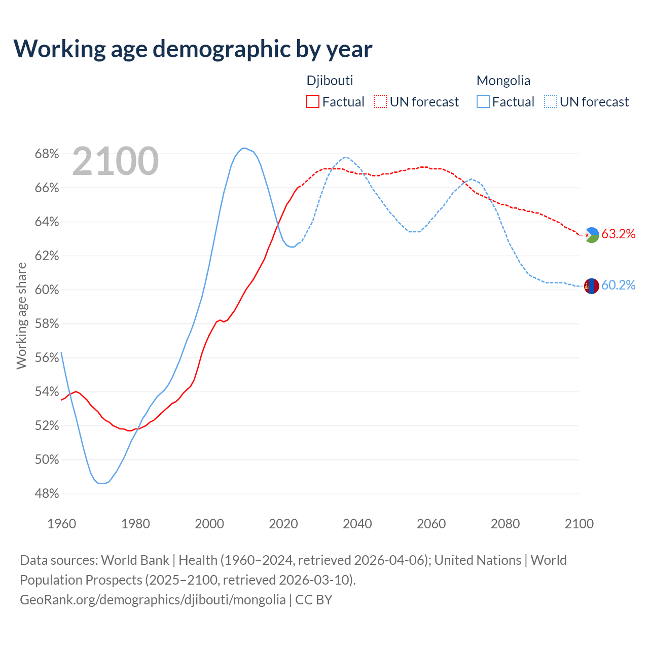 - Djibouti has 794K working age adults (aged 15-64) vs 2.27M in Mongolia.