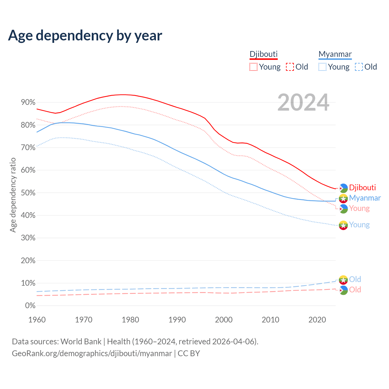 - Djibouti is ranked 129/196 by median age (oldest to youngest) vs 96/196 for Myanmar.