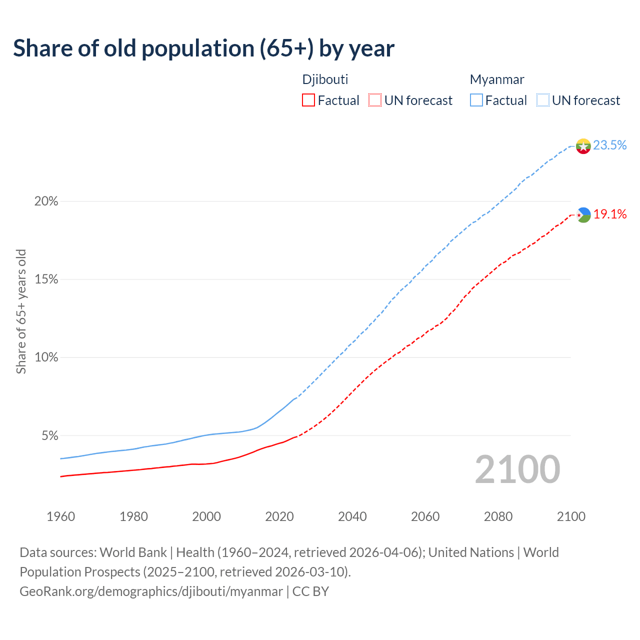 - The share of old-age demographic (65+) in Djibouti is 4.85% vs 7.3% in Myanmar.