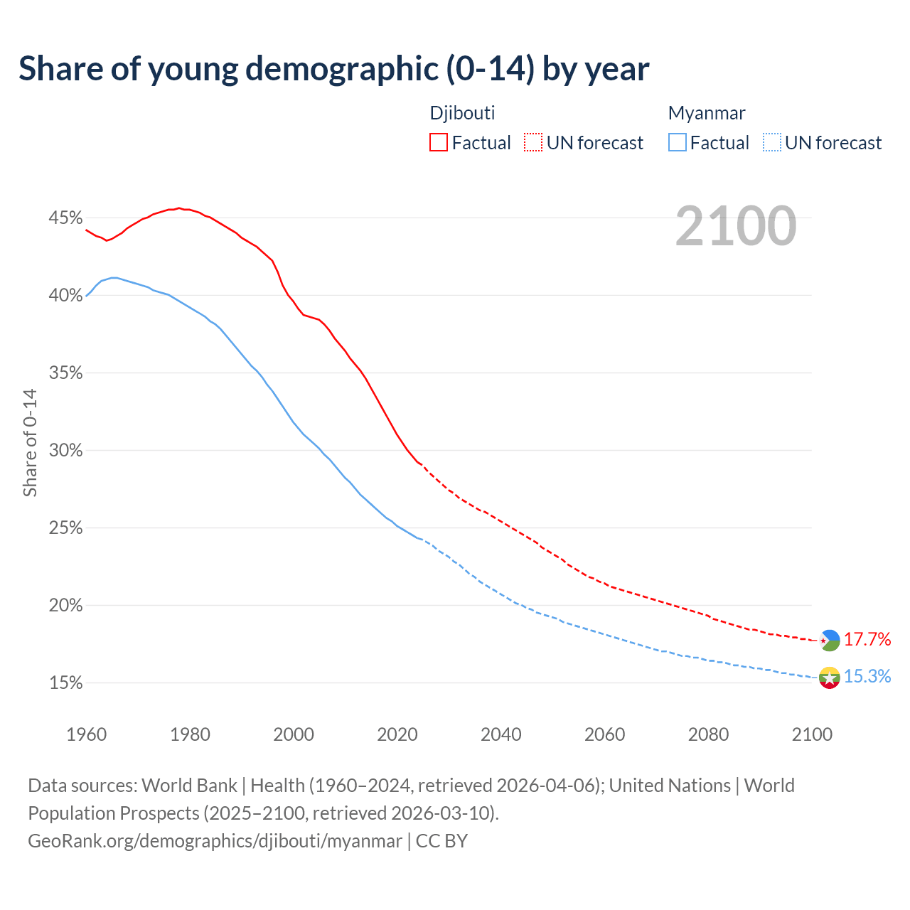 - The share of young demographic (0-15 years old) in Djibouti is 29.2% vs 24.3% in Myanmar.