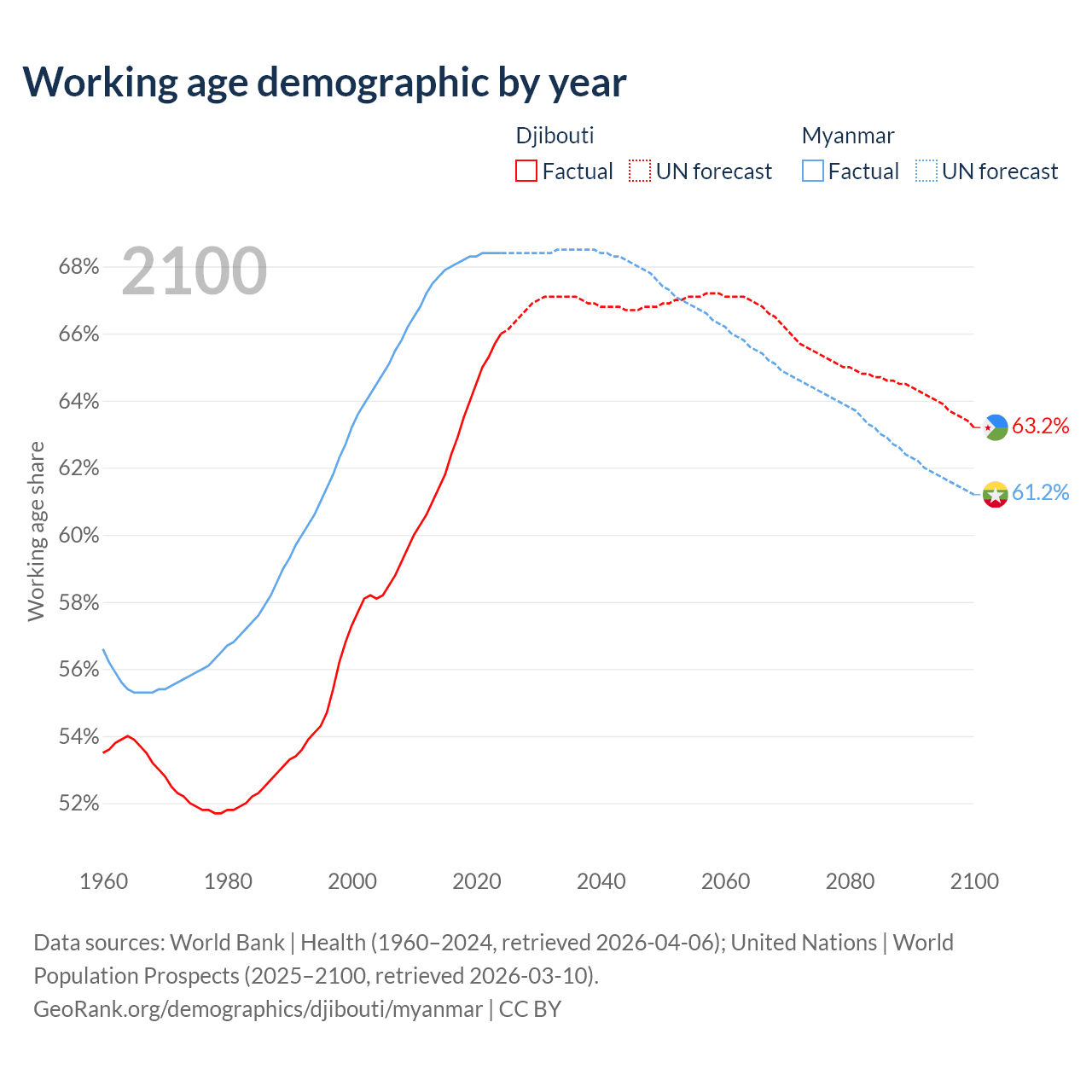 - Djibouti has 794K working age adults (aged 15-64) vs 37.8M in Myanmar.