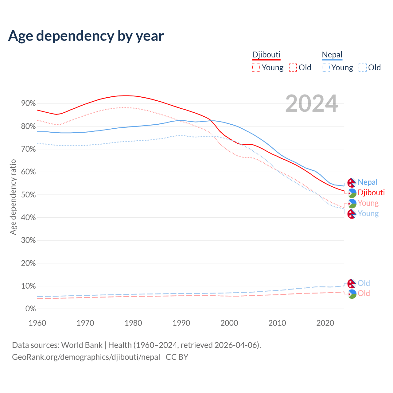 - The share of old-age demographic (65+) in Djibouti is 4.85% vs 6.5% in Nepal.