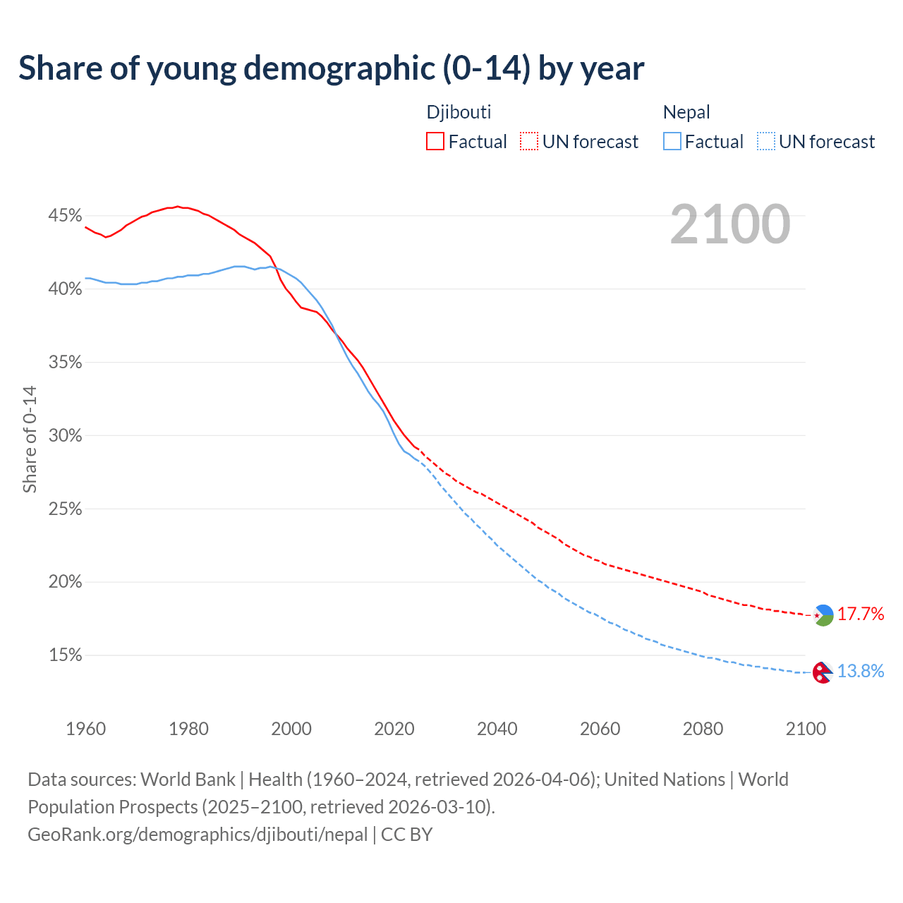 - The share of young demographic (0-15 years old) in Djibouti is 29.2% vs 28.4% in Nepal.