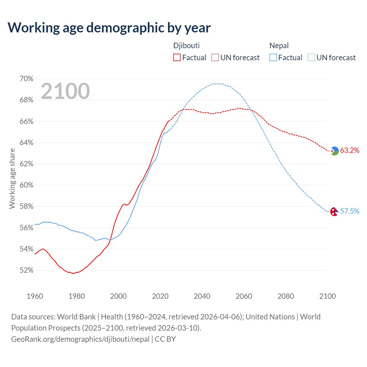 Median age Djibouti vs Nepal, 1960-2100