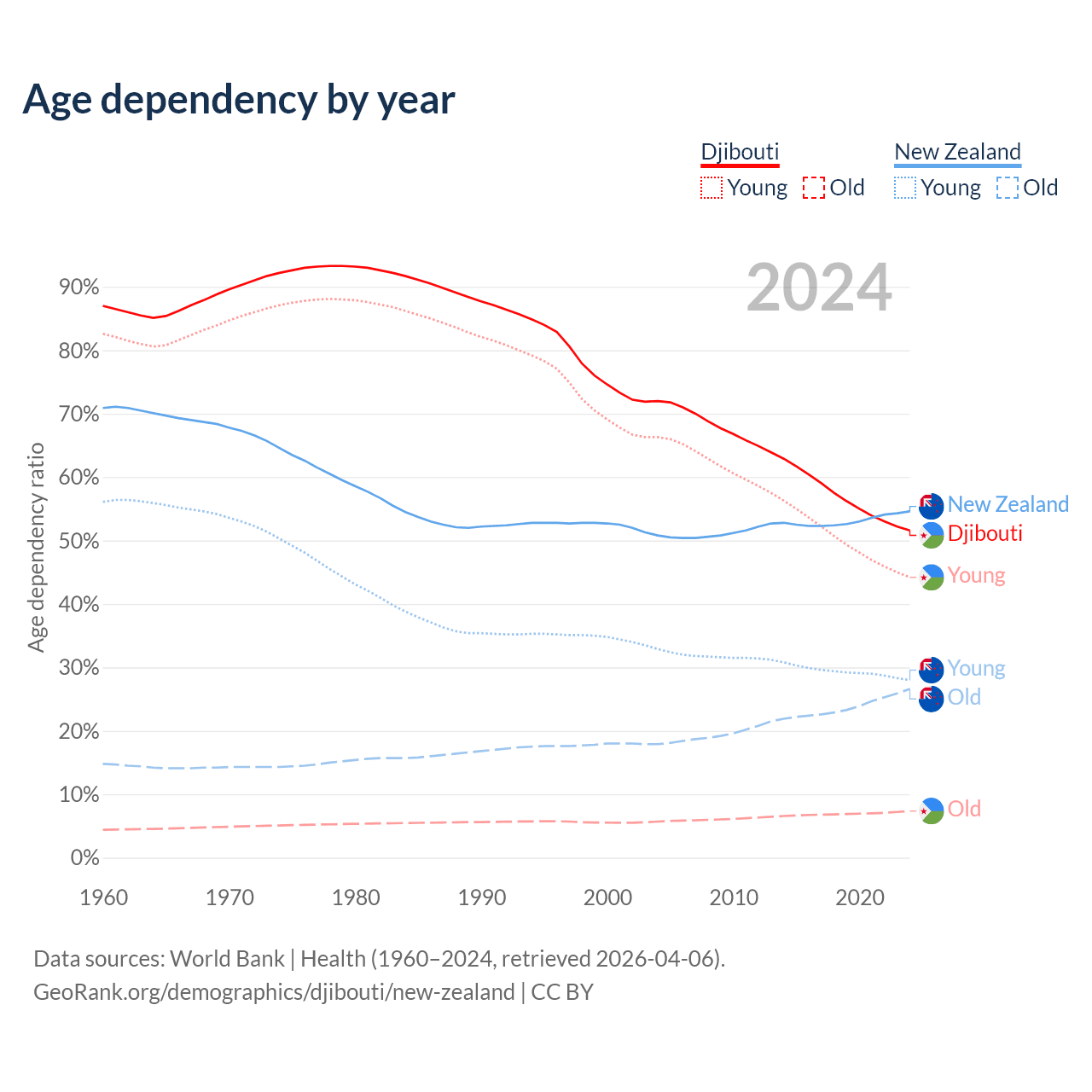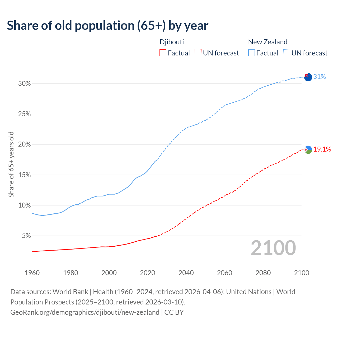 - The share of old-age demographic (65+) in Djibouti is 4.85% vs 17.2% in New Zealand.