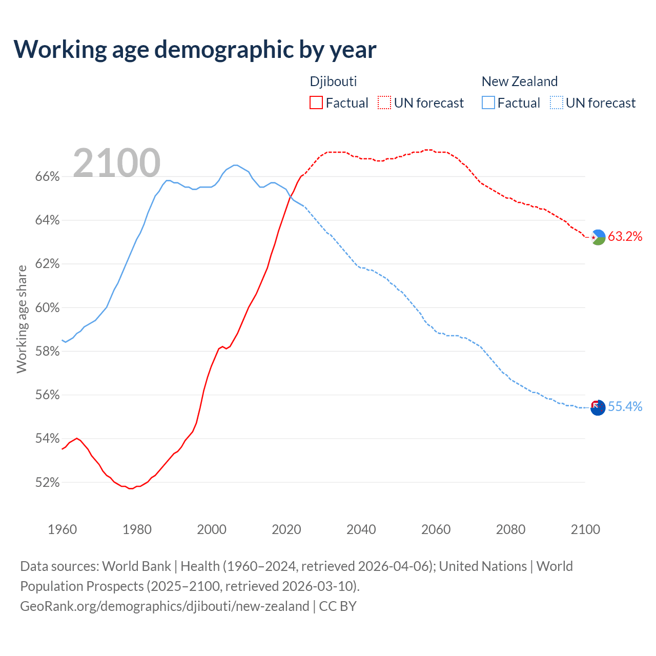 - Djibouti has 794K working age adults (aged 15-64) vs 3.48M in New Zealand.