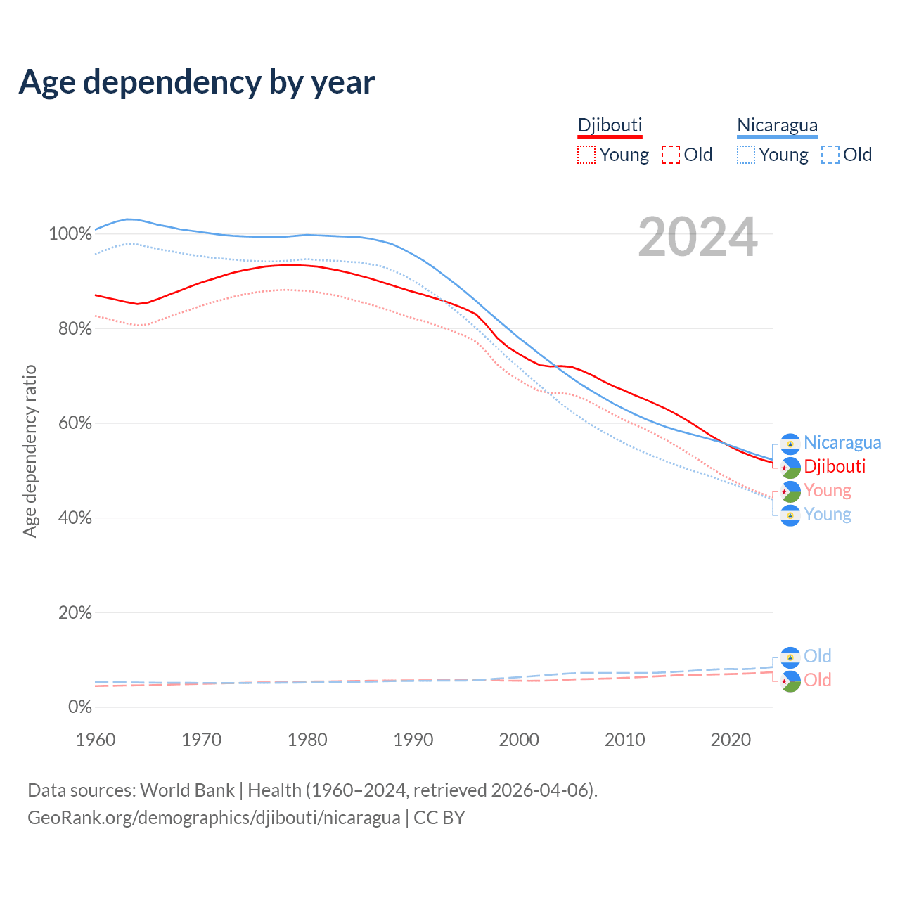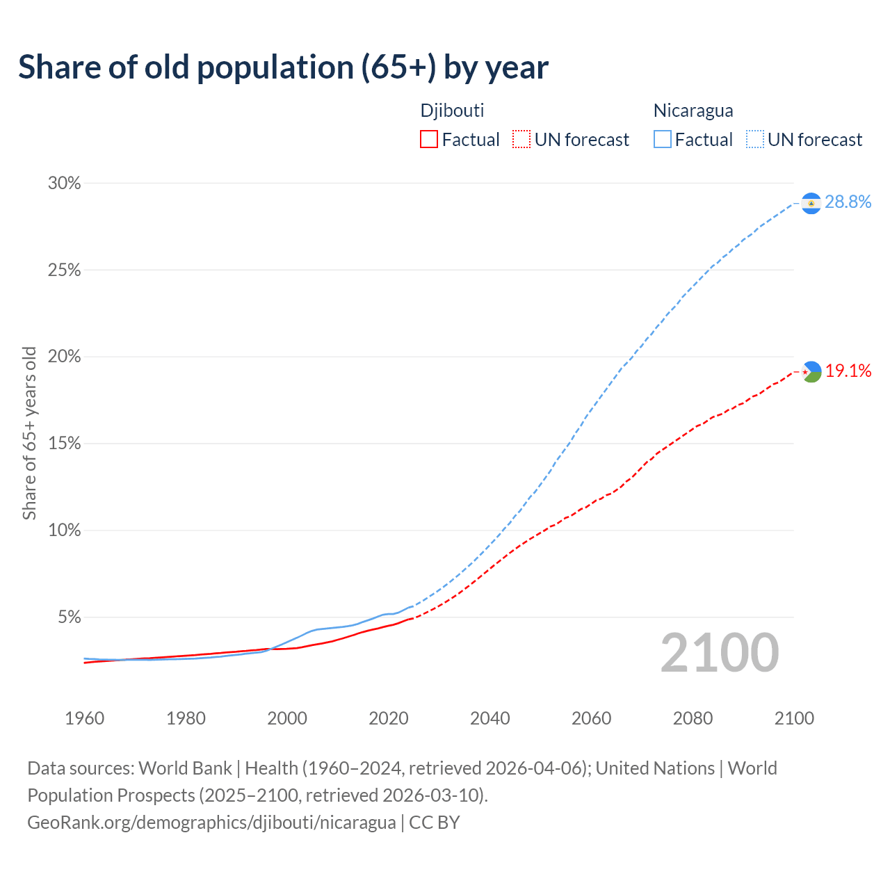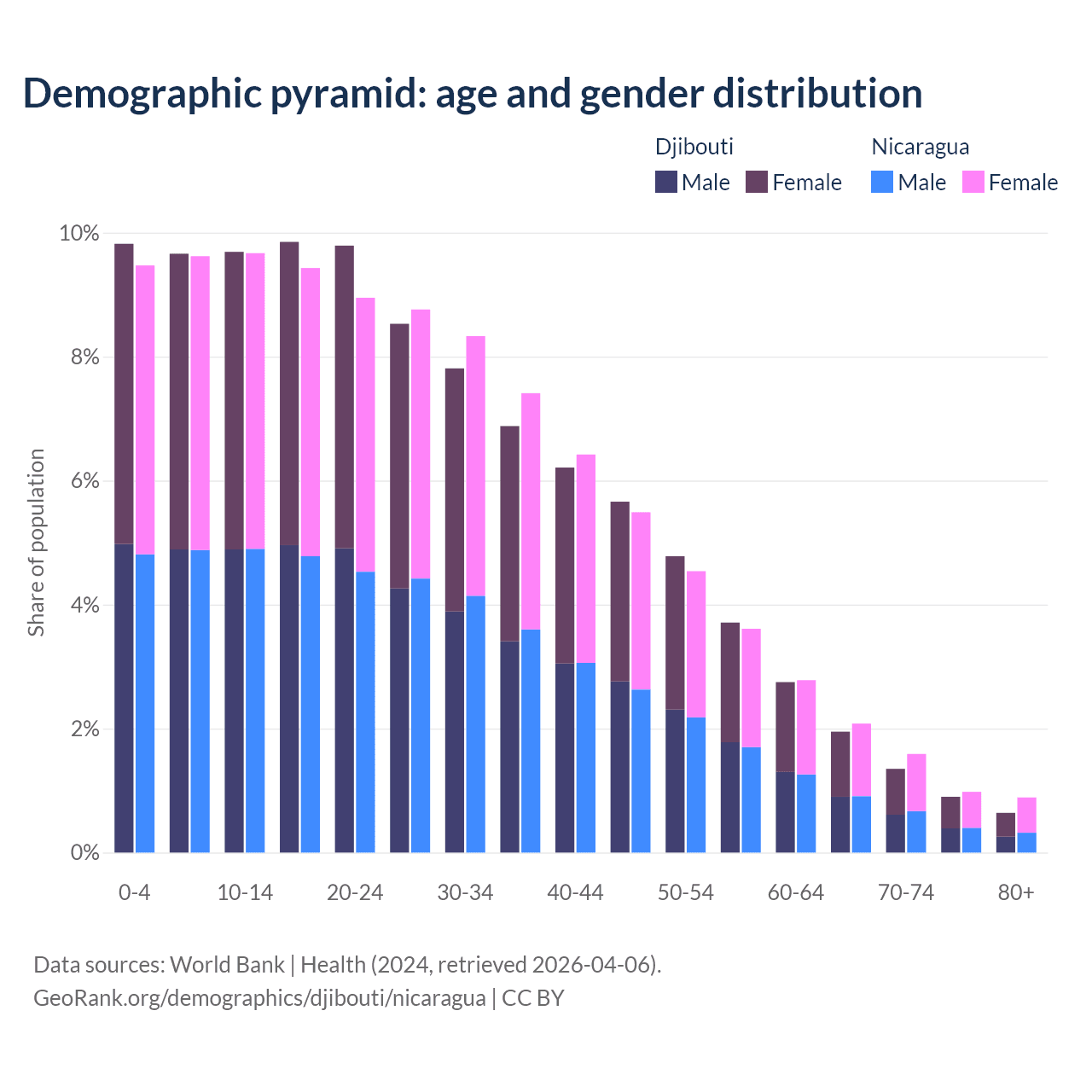 - The share of old-age demographic (65+) in Djibouti is 4.85% vs 5.53% in Nicaragua.