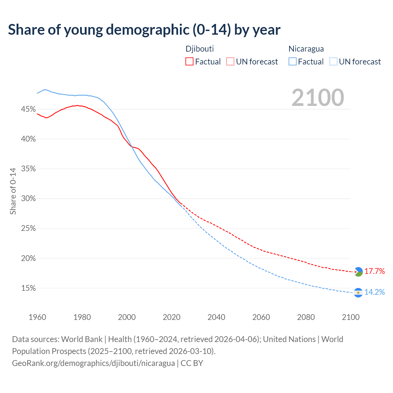 - The share of young demographic (0-15 years old) in Djibouti is 29.2% vs 28.8% in Nicaragua.