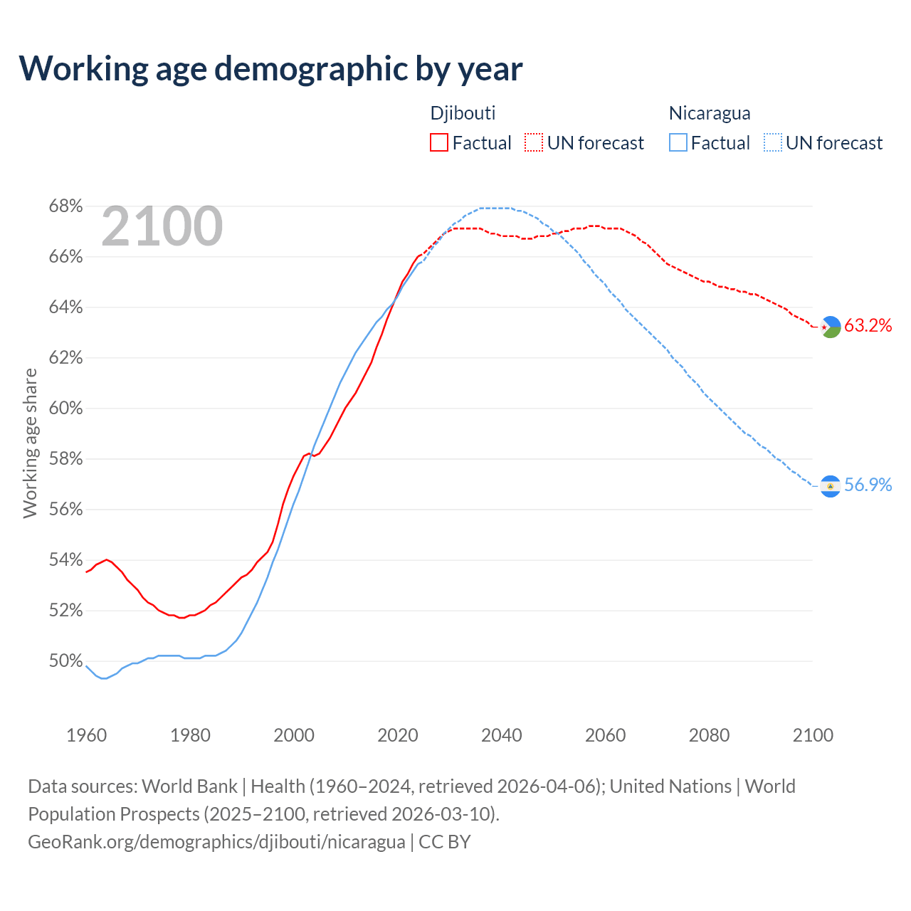 Median age Djibouti vs Nicaragua, 1960-2100