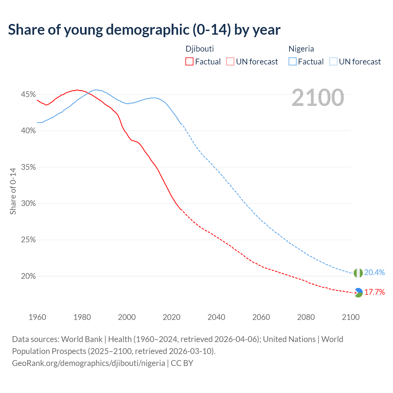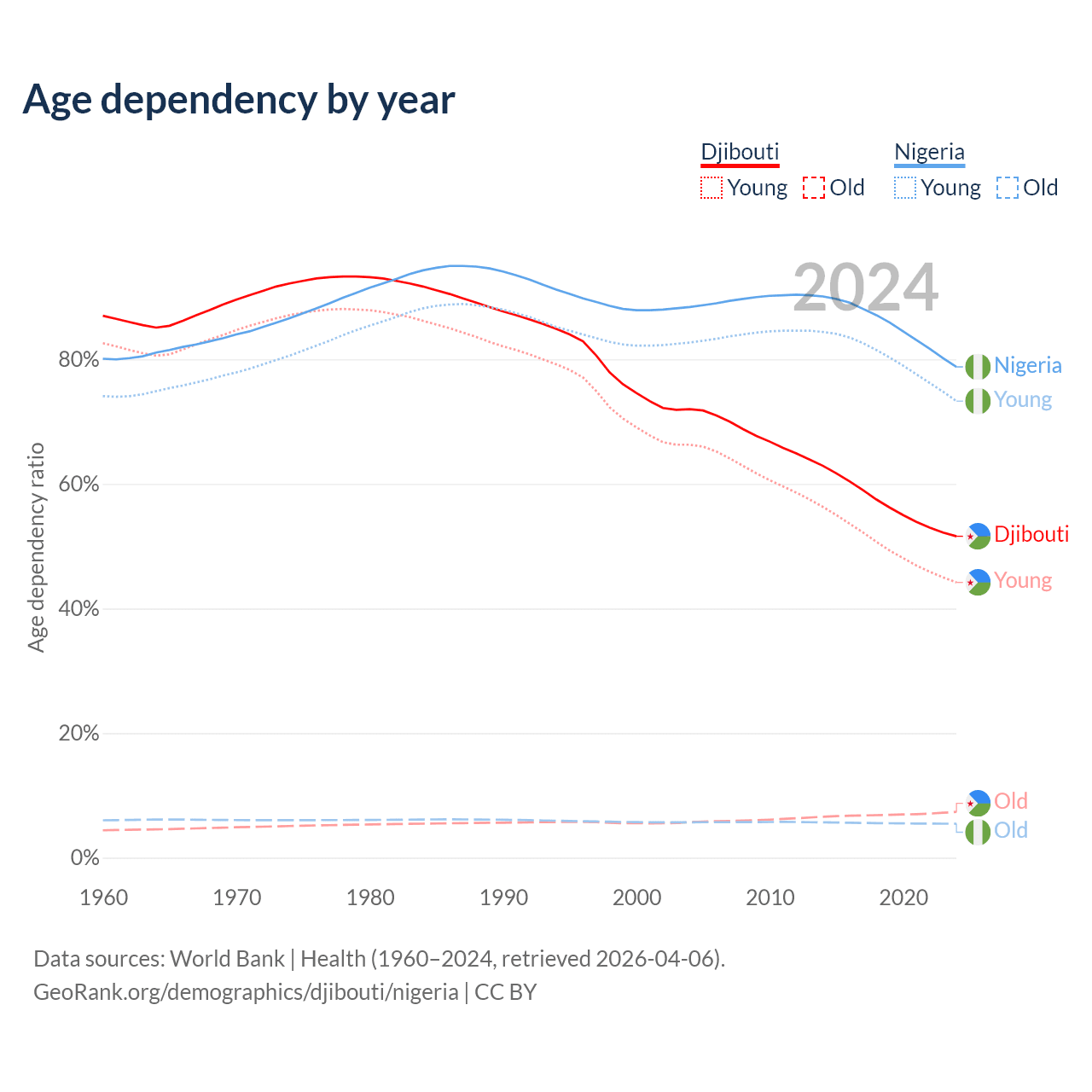 - Djibouti is ranked 129/196 by median age (oldest to youngest) vs 178/196 for Nigeria.