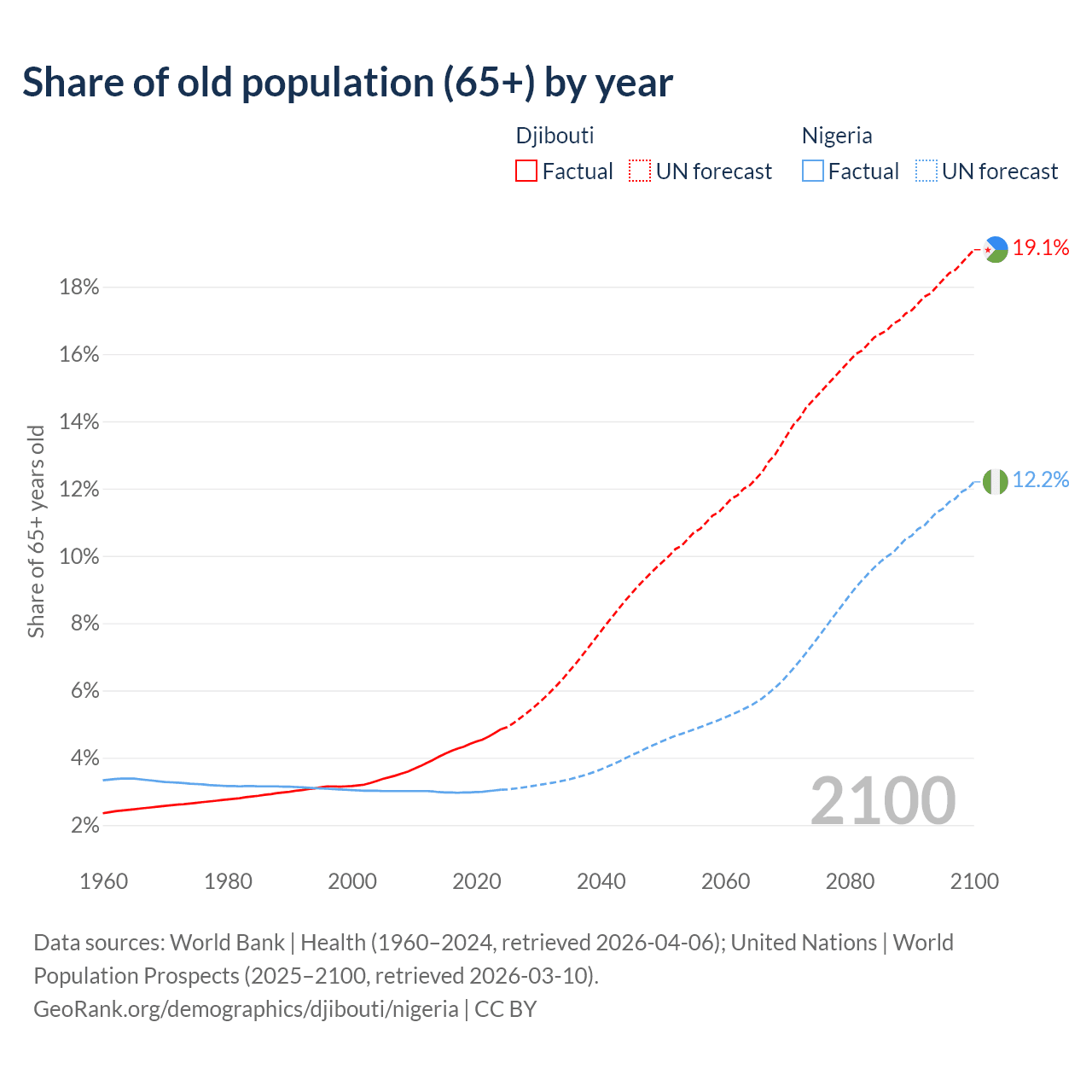 - The share of old-age demographic (65+) in Djibouti is 4.85% vs 3.05% in Nigeria.