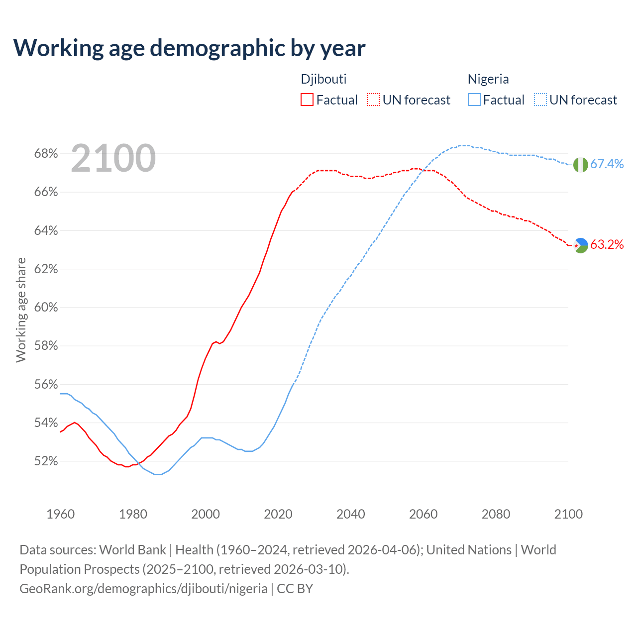 - Djibouti has 794K working age adults (aged 15-64) vs 136M in Nigeria.