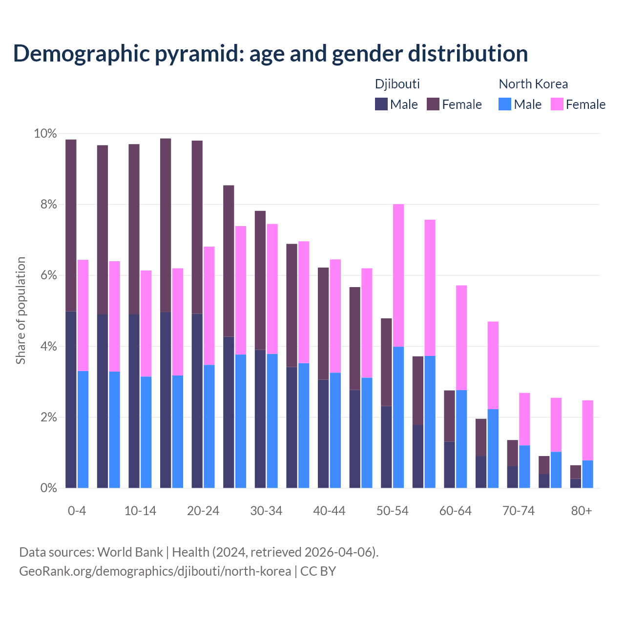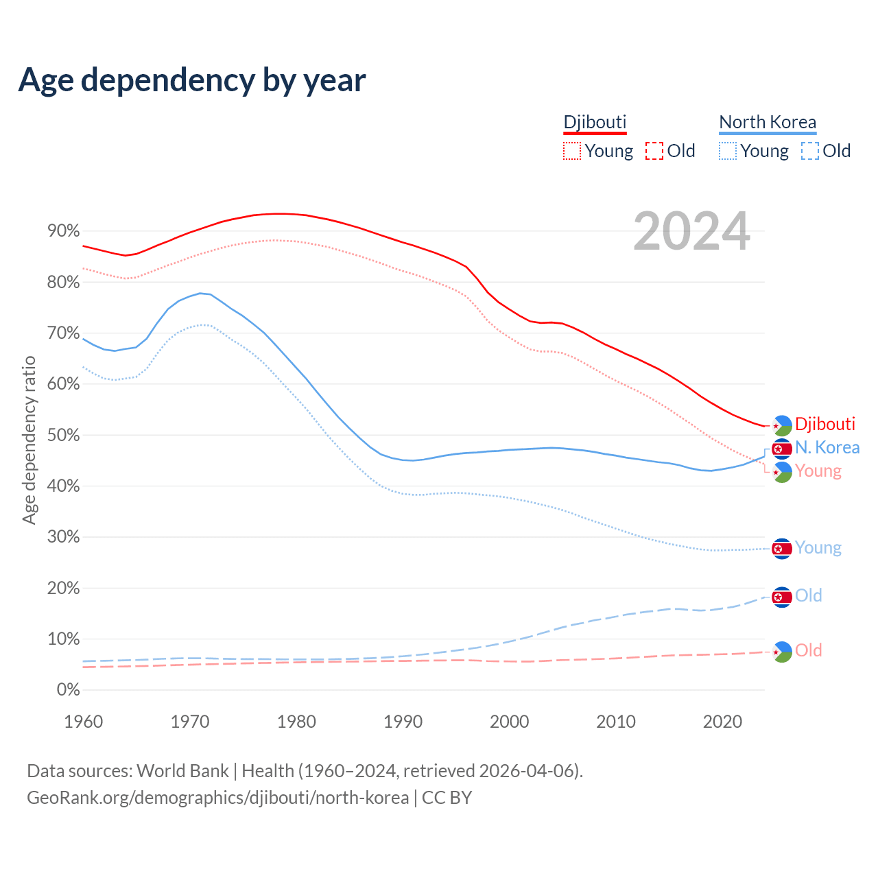 - The share of old-age demographic (65+) in Djibouti is 4.85% vs 12.4% in North Korea.