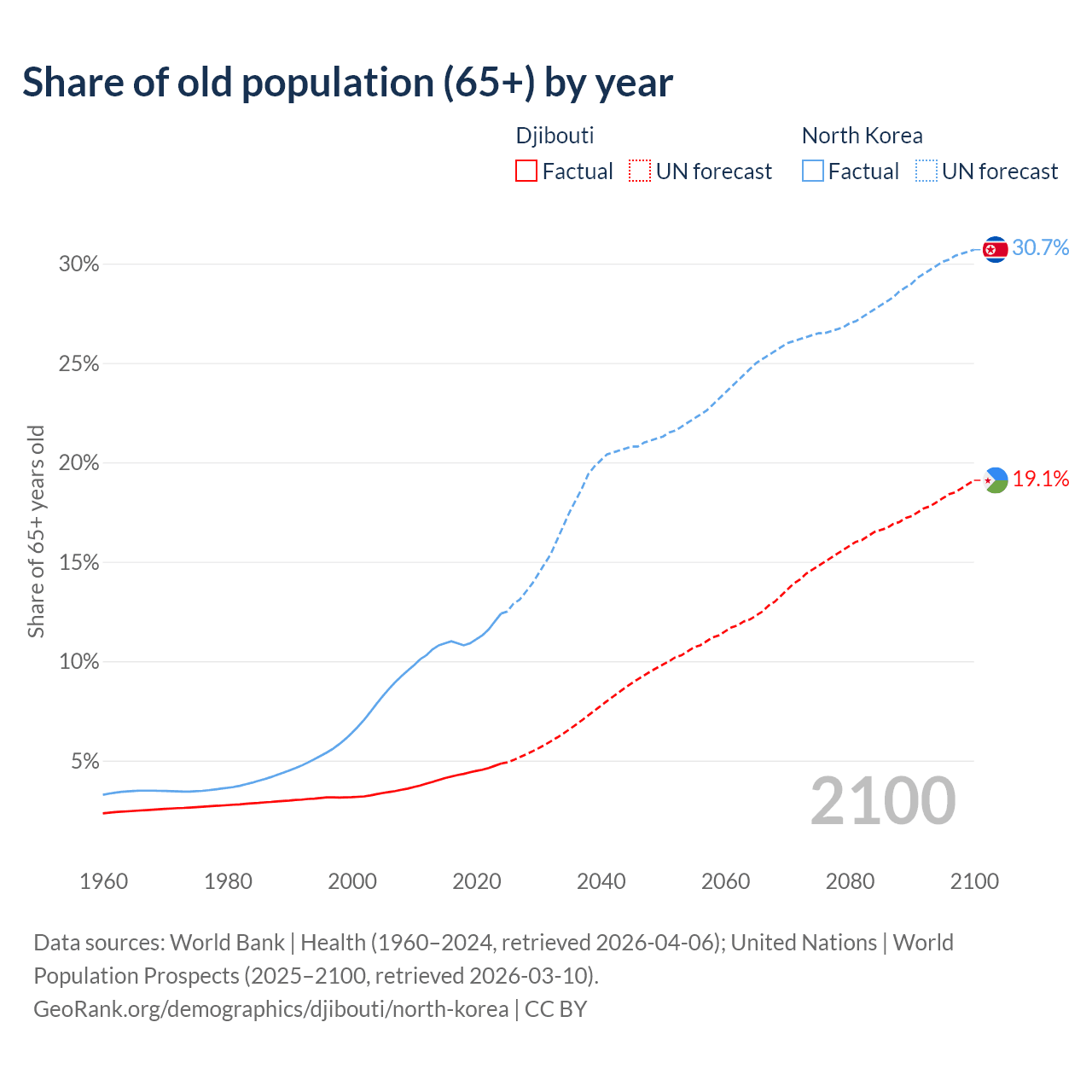 The share of older people aged 65 and over is 4.85% in Djibouti and 12.4% in North Korea. Life expectancy in Djibouti compared to North Korea .