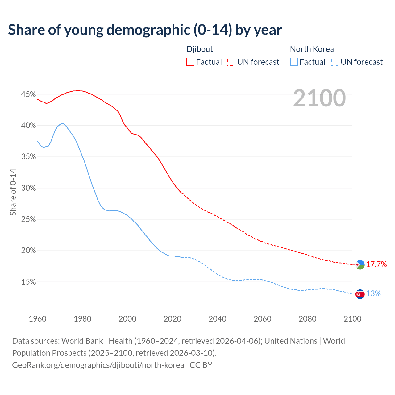 - The share of young demographic (0-15 years old) in Djibouti is 29.2% vs 18.9% in North Korea.