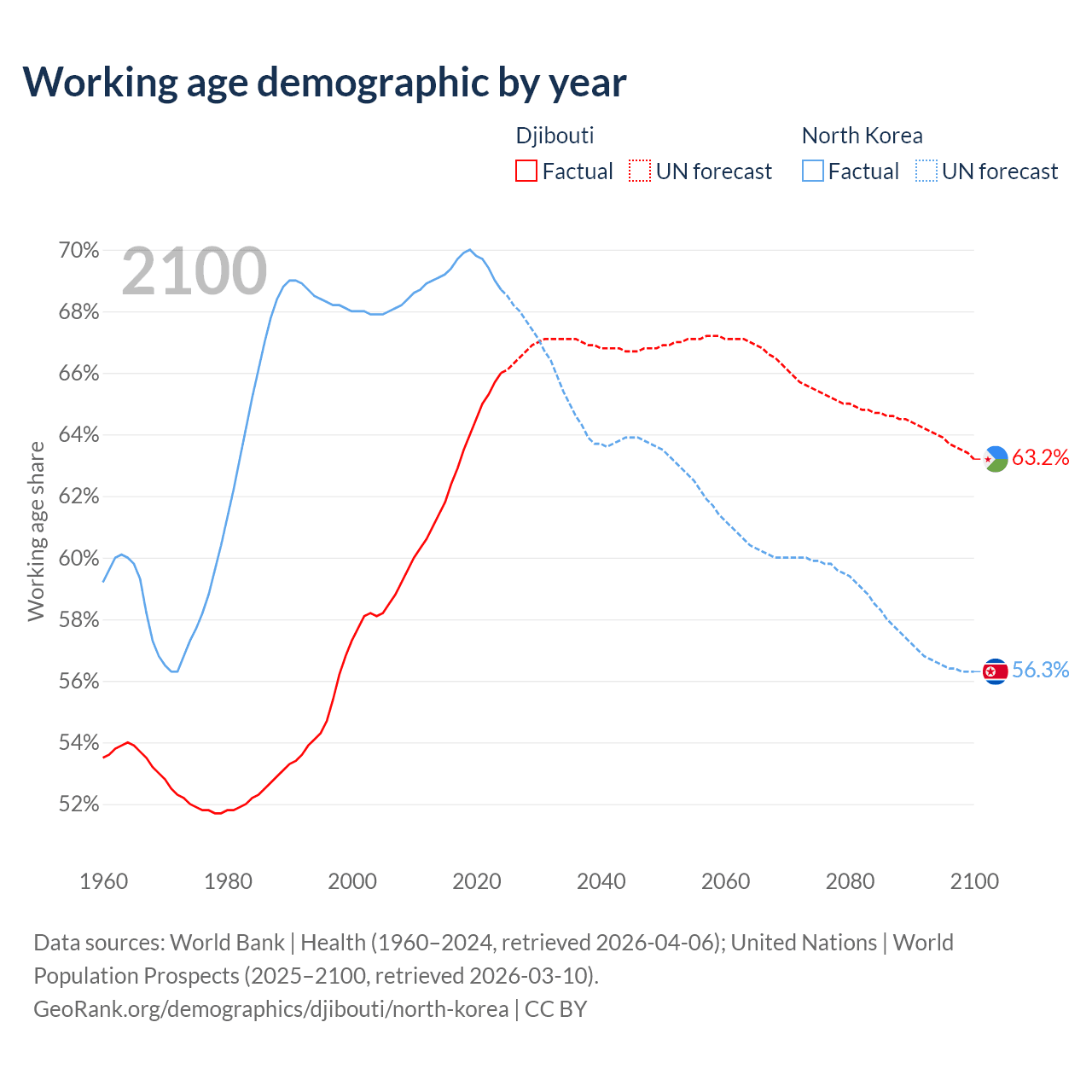 - Djibouti has 794K working age adults (aged 15-64) vs 18.3M in North Korea.