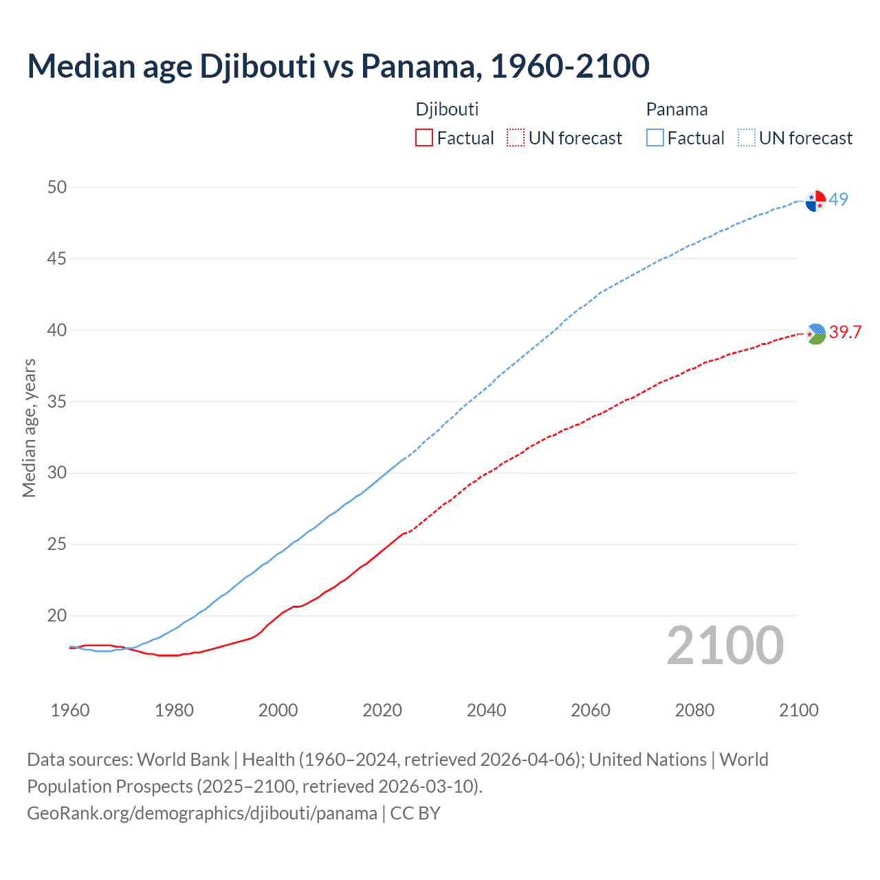Median age Djibouti vs Panama, 1960-2100