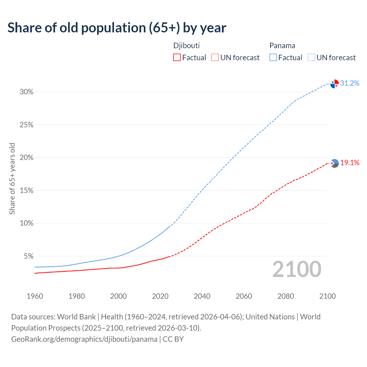 - The share of old-age demographic (65+) in Djibouti is 4.85% vs 9.35% in Panama.