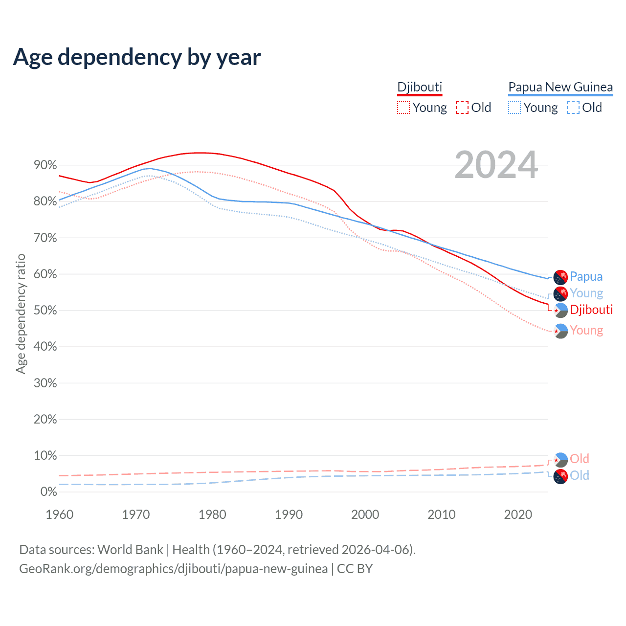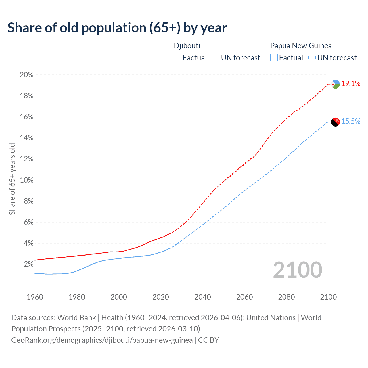 - The share of old-age demographic (65+) in Djibouti is 4.85% vs 3.46% in Papua New Guinea.