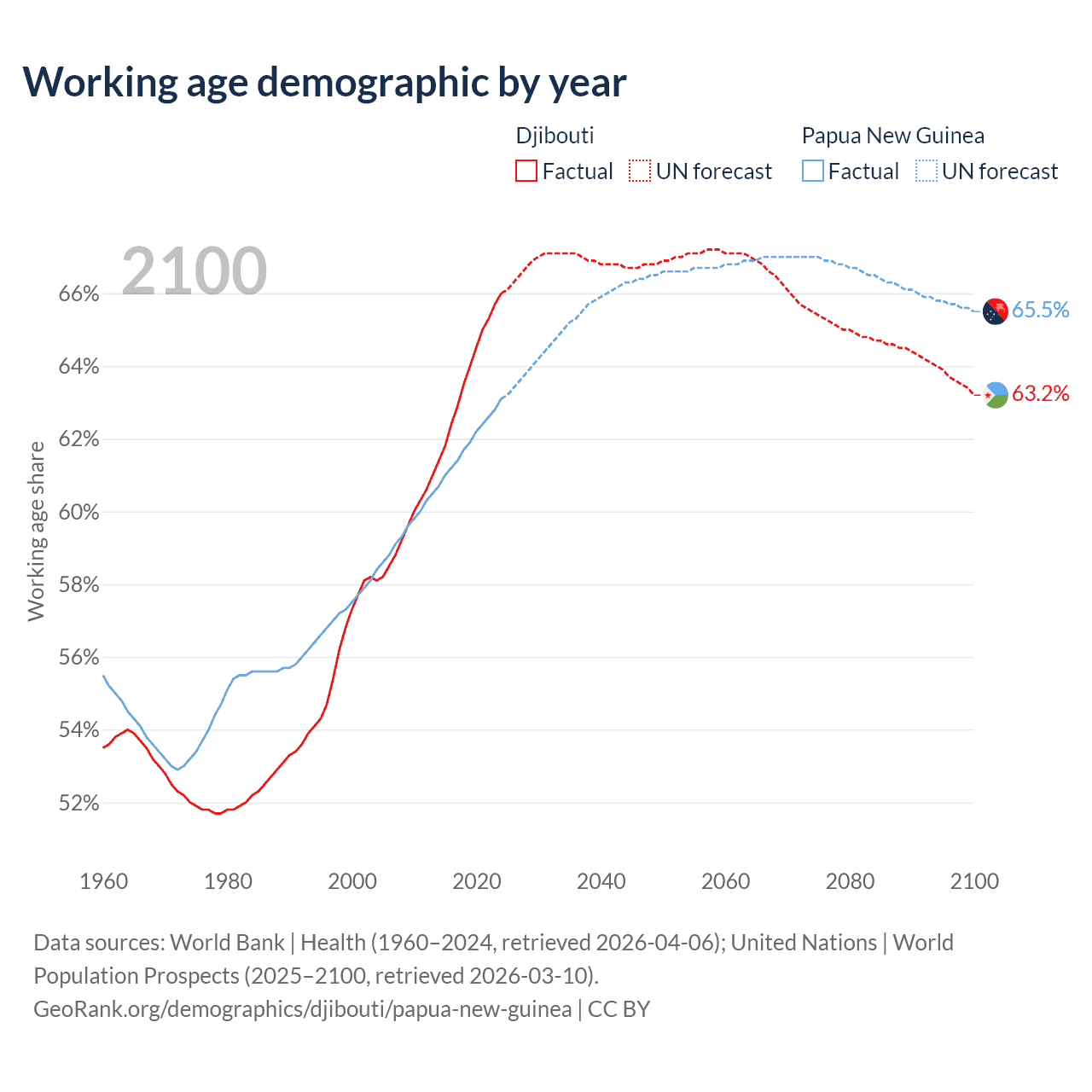 Median age Djibouti vs Papua New Guinea, 1960-2100