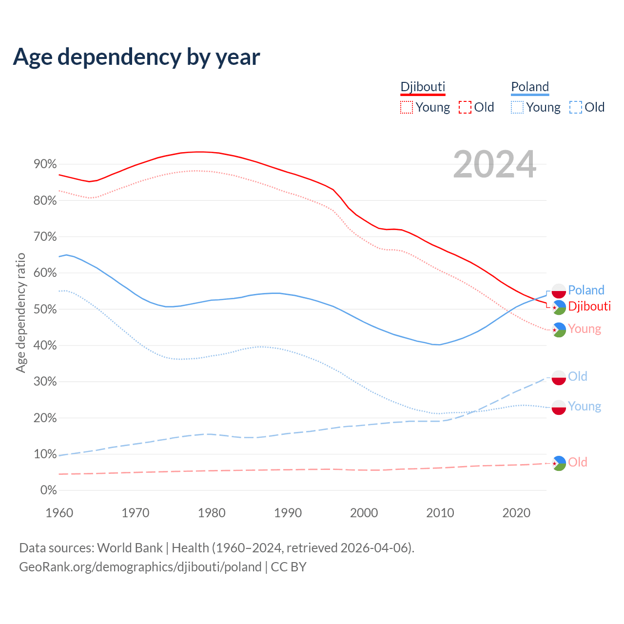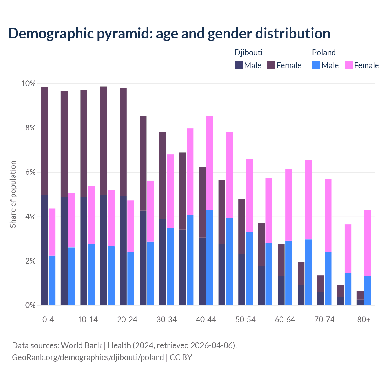 - The share of old-age demographic (65+) in Djibouti is 4.85% vs 20.1% in Poland.