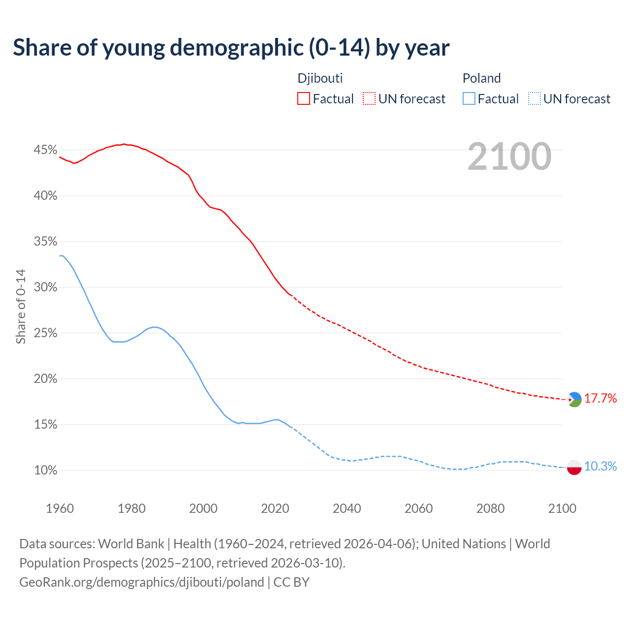 - The share of young demographic (0-15 years old) in Djibouti is 29.2% vs 14.8% in Poland.