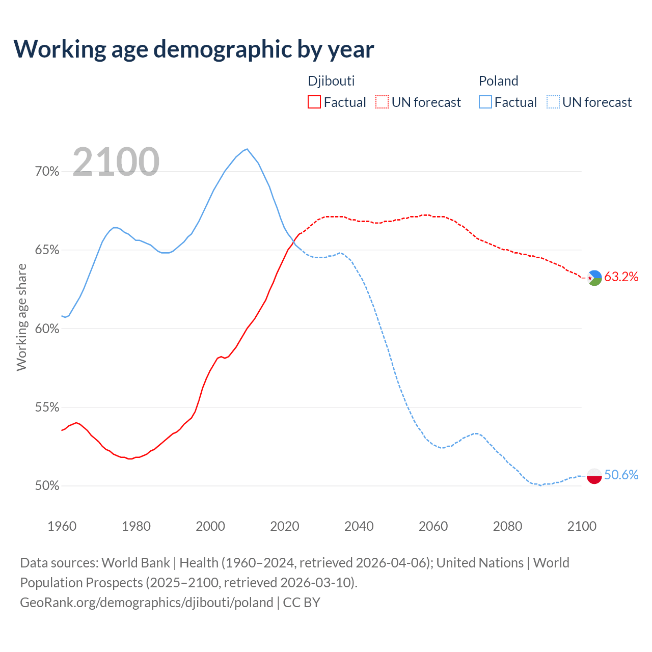 Median age Djibouti vs Poland, 1960-2100