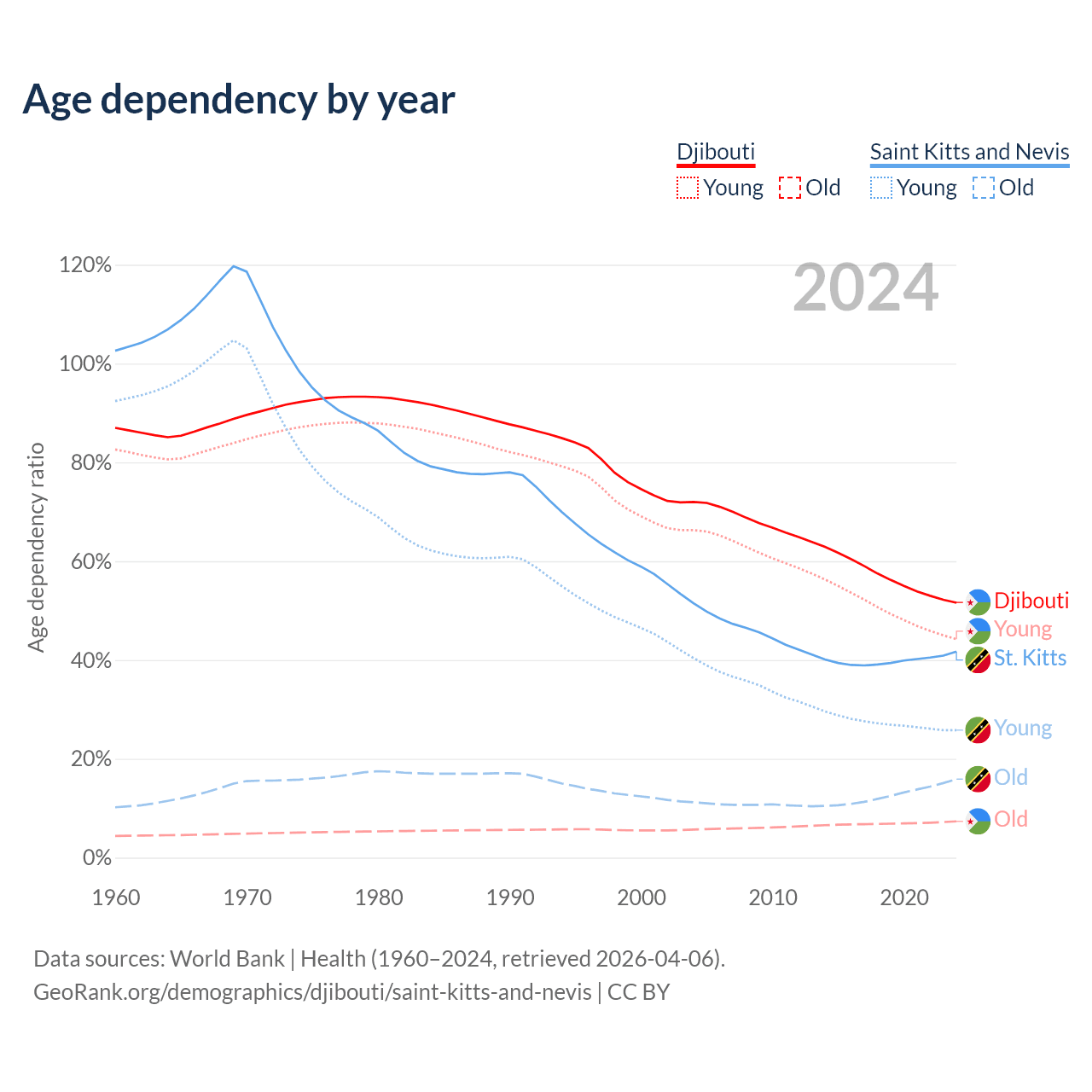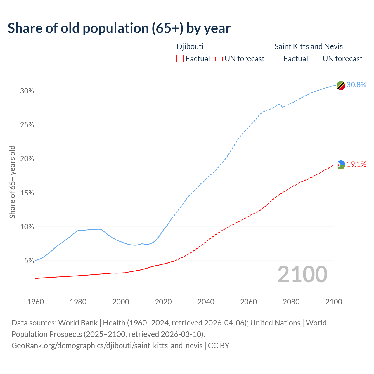 The share of older people aged 65 and over is 4.85% in Djibouti and 11.2% in Saint Kitts and Nevis. Life expectancy in Djibouti compared to Saint Kitts and Nevis .