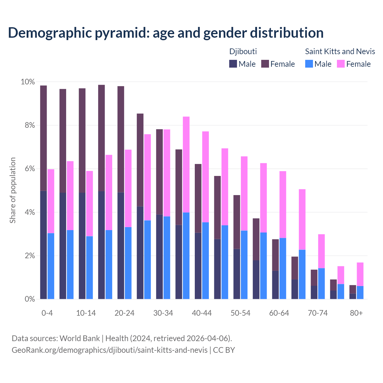 - As of 2026, the population of Djibouti is 1.2M vs 47K in Saint Kitts and Nevis - 25.6 times difference.