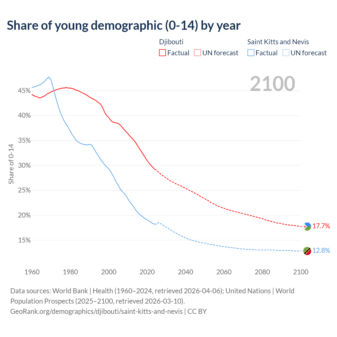- The share of young demographic (0-15 years old) in Djibouti is 29.2% vs 18.2% in Saint Kitts and Nevis.