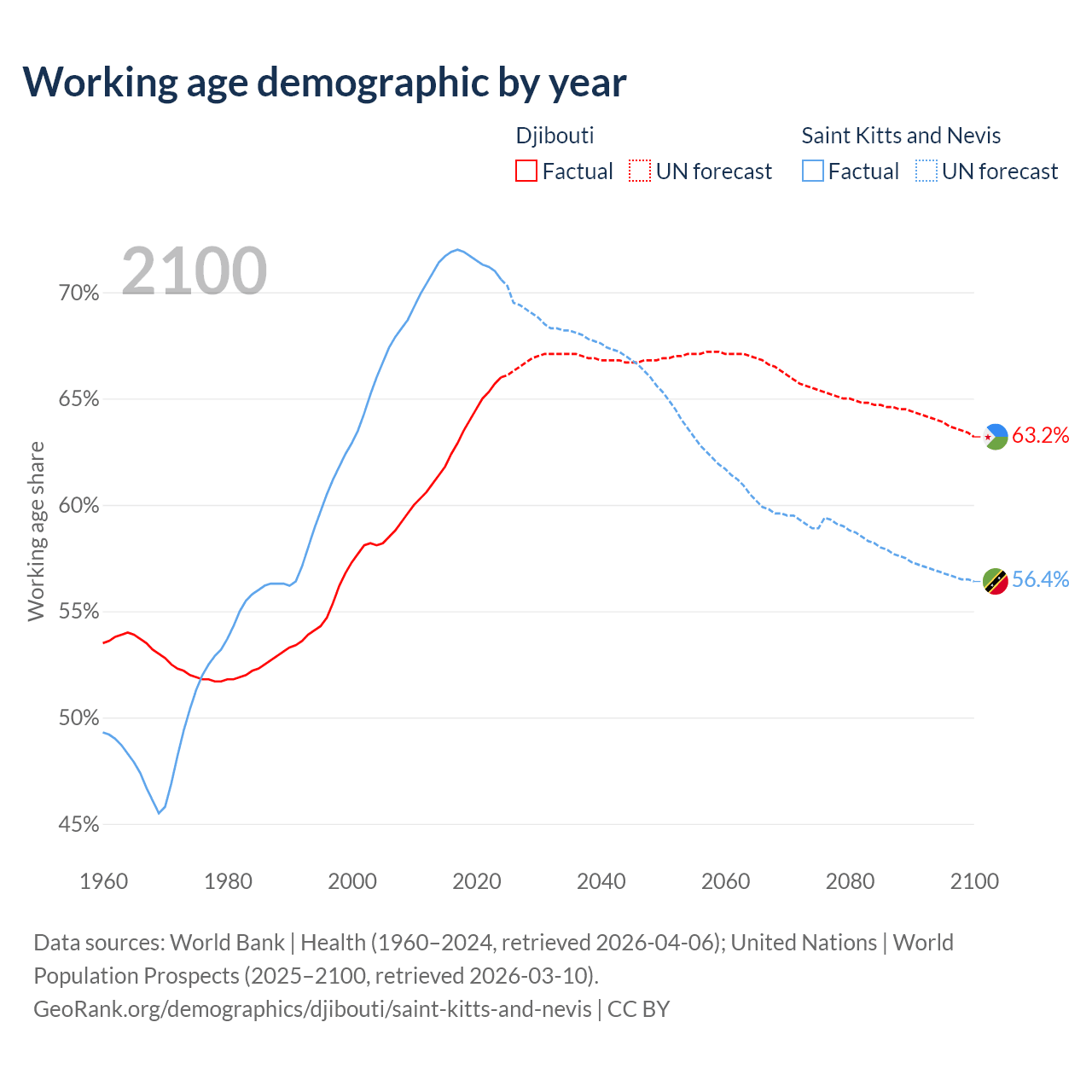 - Djibouti has 794K working age adults (aged 15-64) vs 33.2K in Saint Kitts and Nevis.