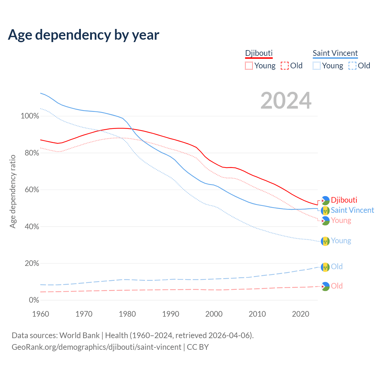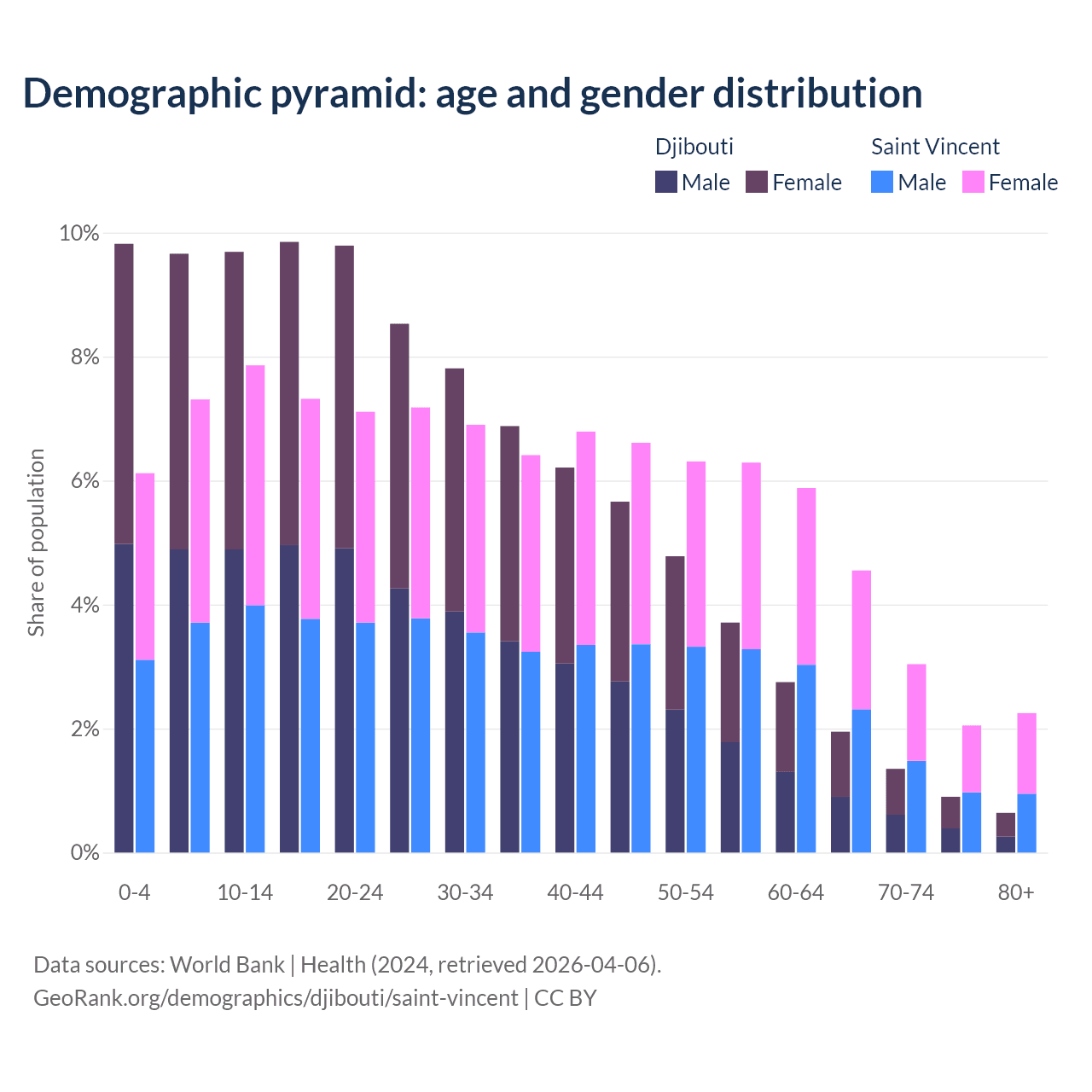 - The share of young demographic (0-15 years old) in Djibouti is 29.2% vs 21.3% in Saint Vincent.