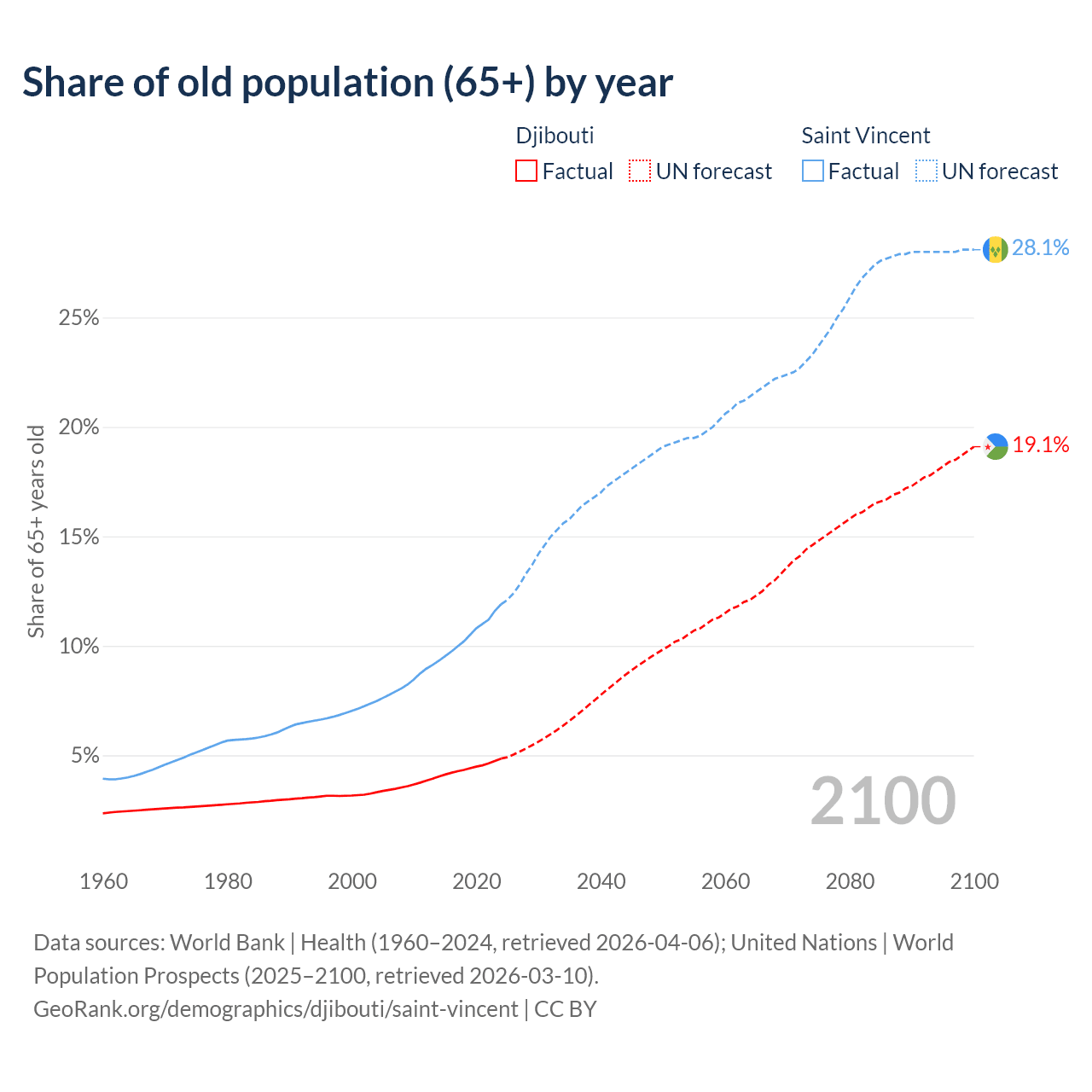 - The share of old-age demographic (65+) in Djibouti is 4.85% vs 11.9% in Saint Vincent.