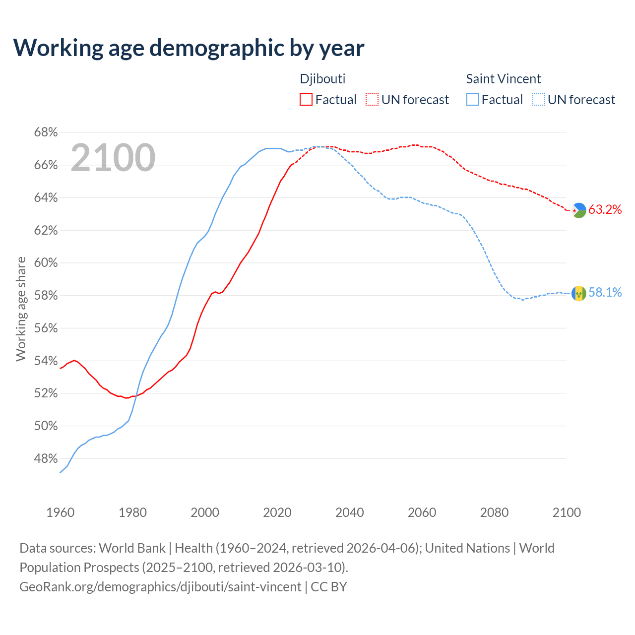 - Djibouti has 794K working age adults (aged 15-64) vs 66.3K in Saint Vincent.