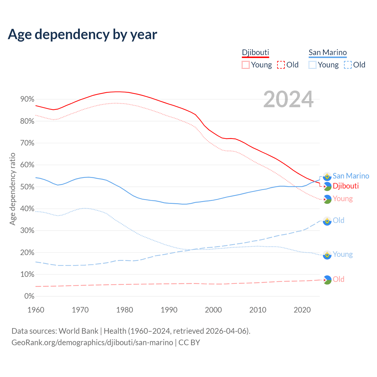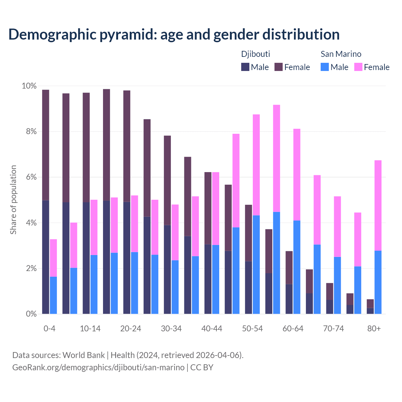 - The share of old-age demographic (65+) in Djibouti is 4.85% vs 22.4% in San Marino.