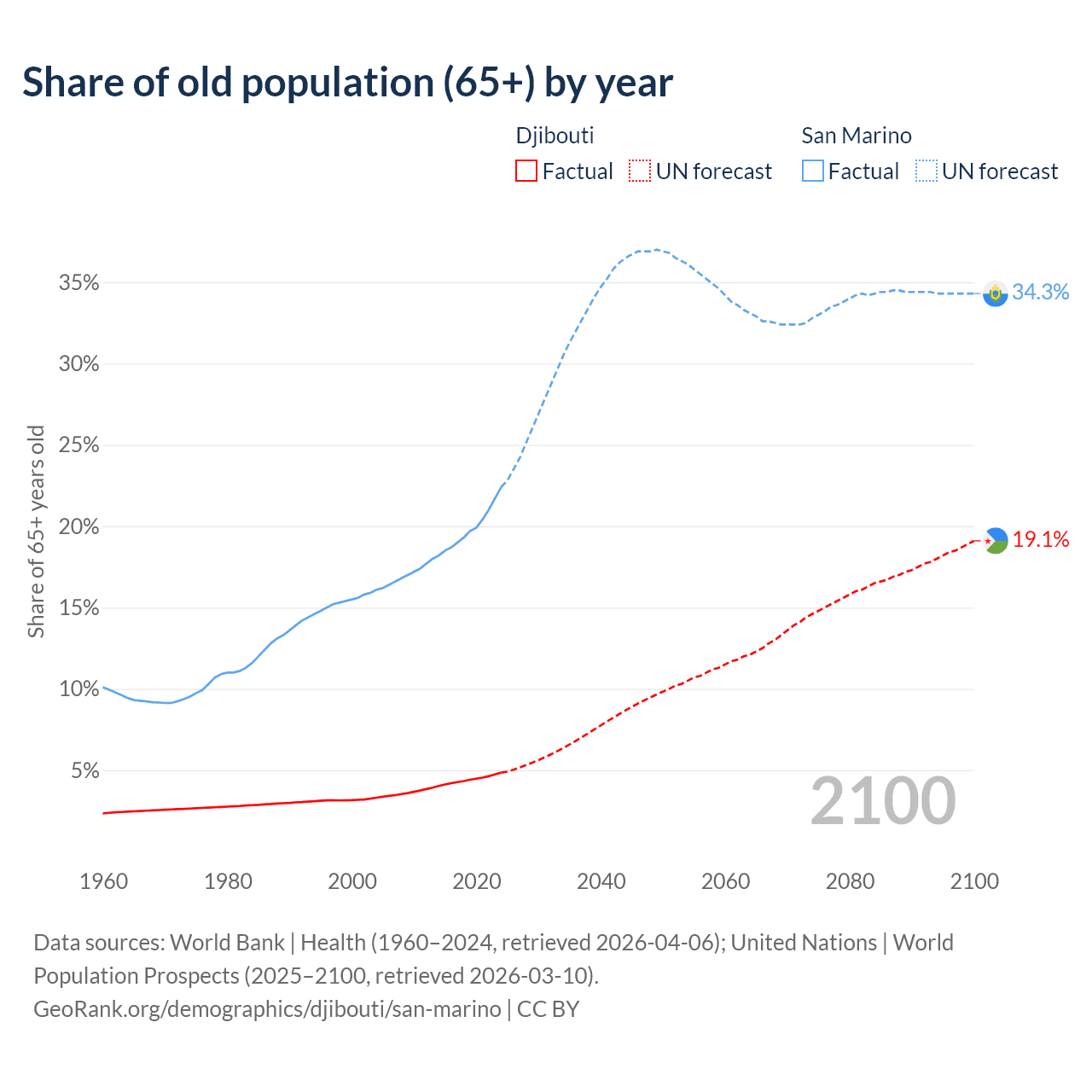 The share of older people aged 65 and over is 4.85% in Djibouti and 22.4% in San Marino. Life expectancy in Djibouti compared to San Marino .