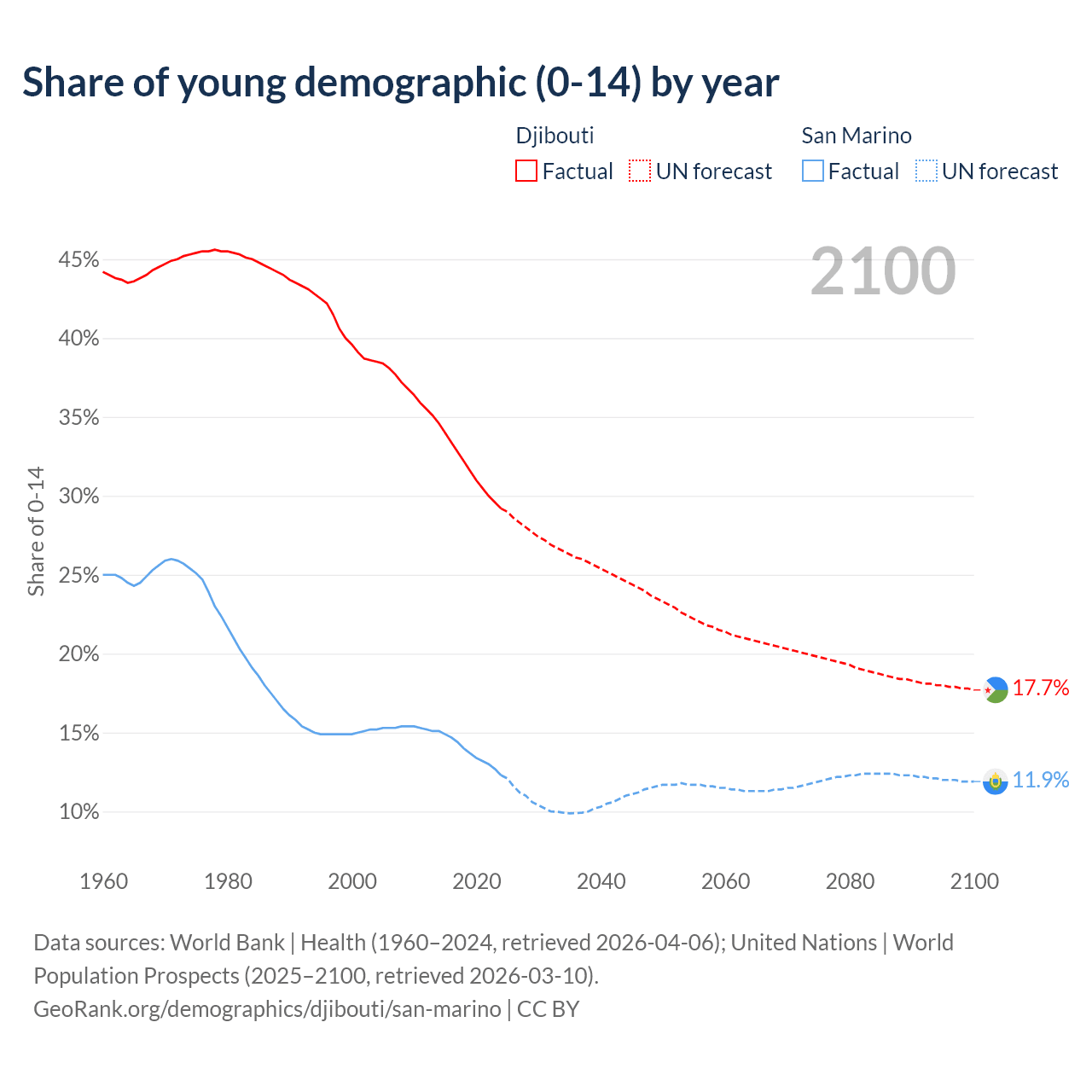 - The share of young demographic (0-15 years old) in Djibouti is 29.2% vs 12.3% in San Marino.
