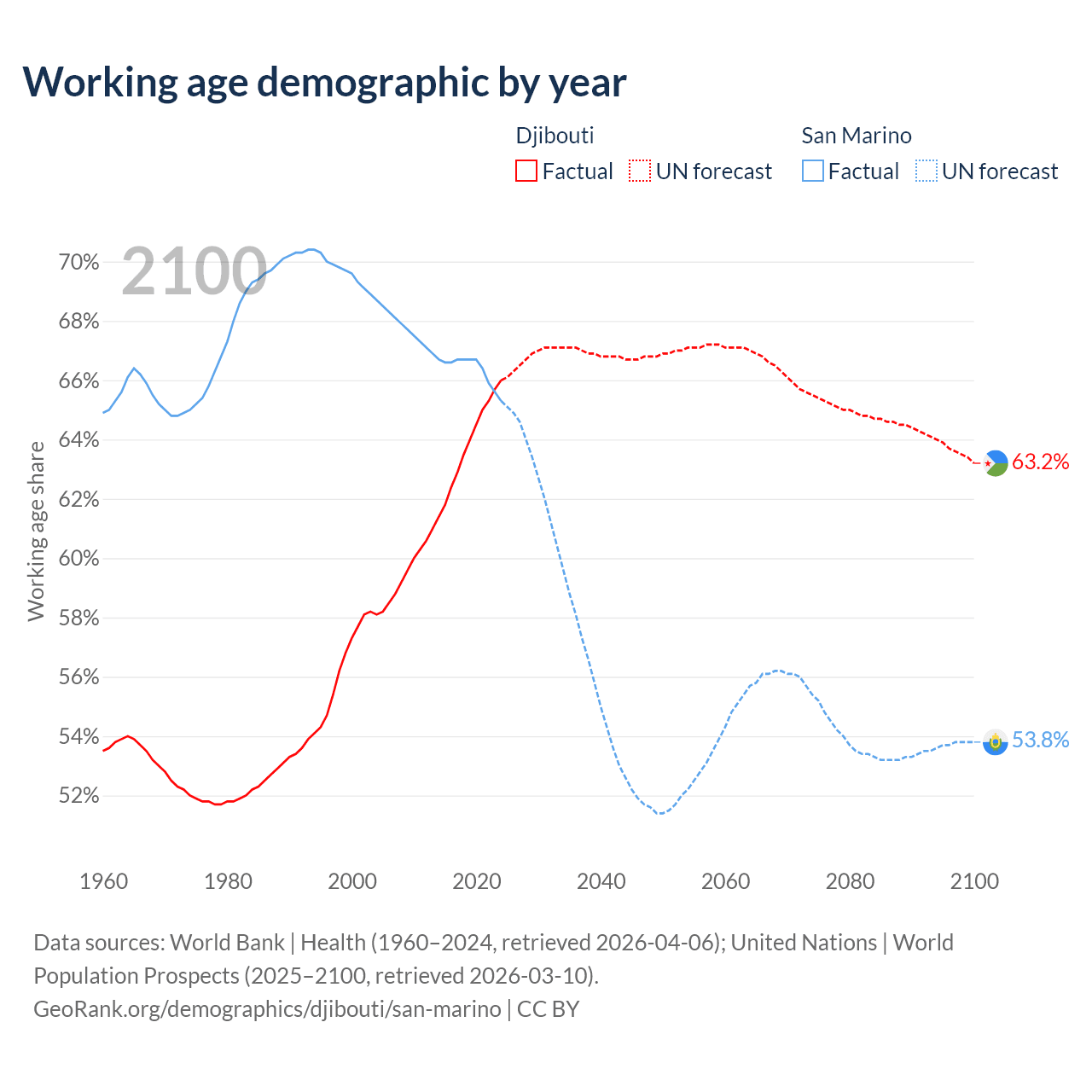 - Djibouti has 794K working age adults (aged 15-64) vs 22.2K in San Marino.